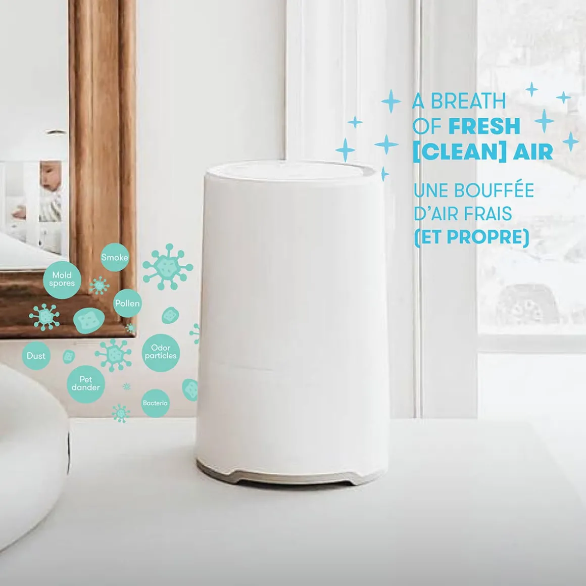 - HEPA FILTER: Removes mold spores, pollen, smoke, odors + pollution from the air