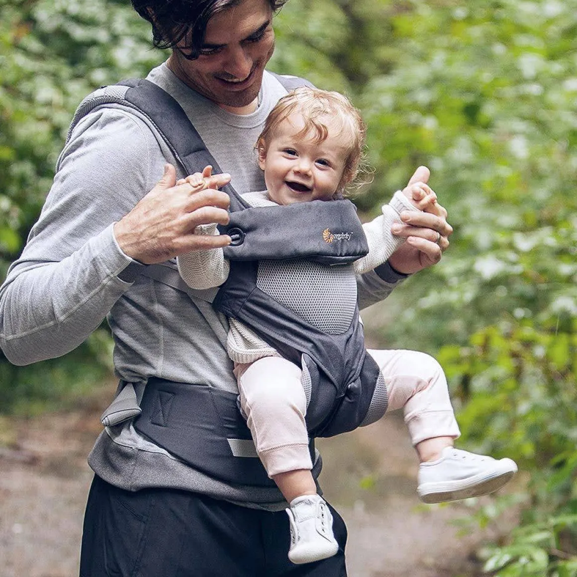 The Ergobaby Four Position 360 Cool Air Carrier in Carbon Grey, made with 3D Air Mesh fabric to keep baby cooler longer. Offering four carry positions, including our ergonomic forward facing option.