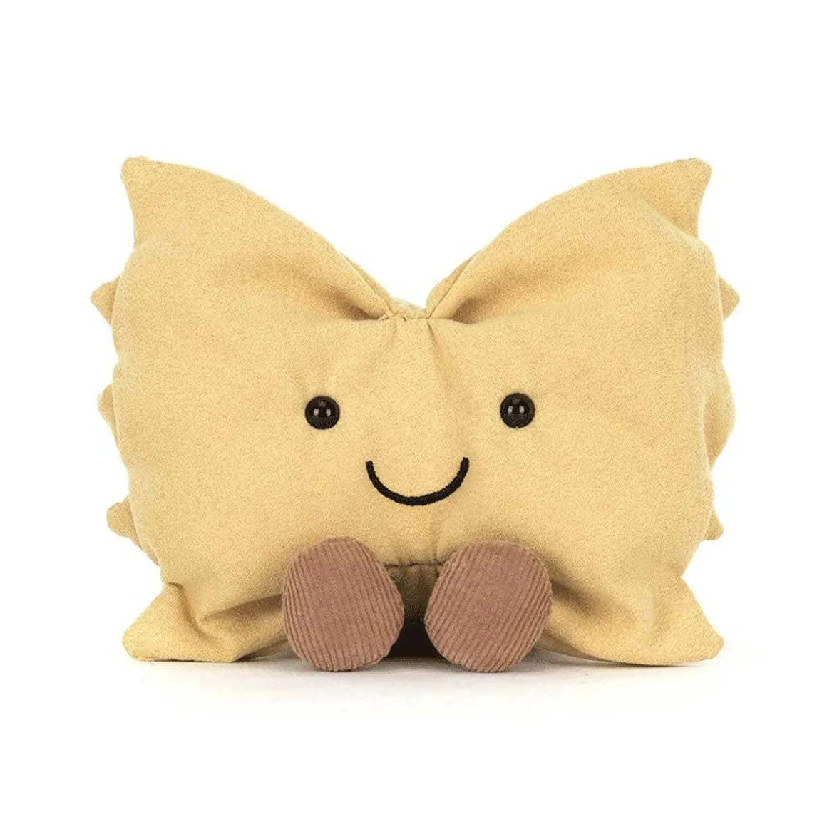 Perky and pally, it’s Amuseables Farfalle! This dapper pasta looks just like a bow tie, in snuggly stitchy golden fur. With bright eyes, a big smile and kicky cord boots, this mischievous matey’s always in hot water!