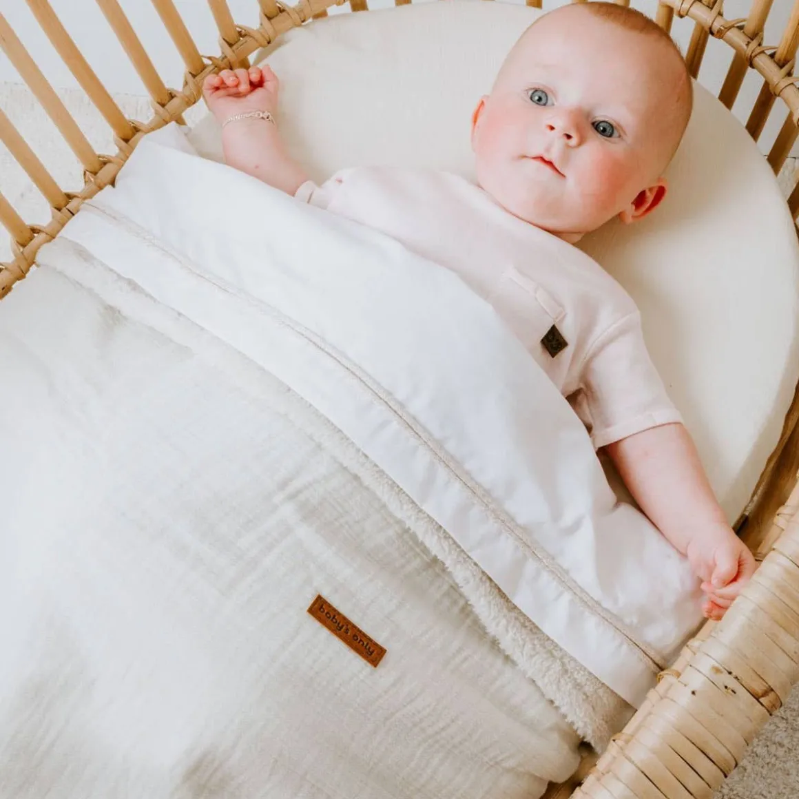 The teddy Breeze warm linen cradle blanket from the Baby’s Only collection is made of 100% cotton fabric with a teddy fabric backing. With the airy look of the cotton and the warmth of the teddy fabric, this is an ideal cradle blanket for the colder days in spring and summer. The Breeze cradle blanket is recognizable as a hydrophilic fabric that is a must for your baby’s care. With size 70×95 cm this cradle blanket fits exactly in the baby cradle.