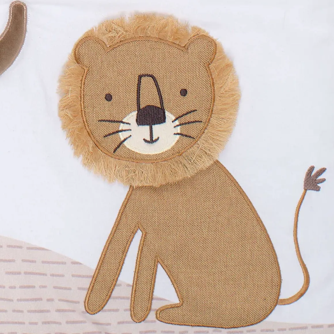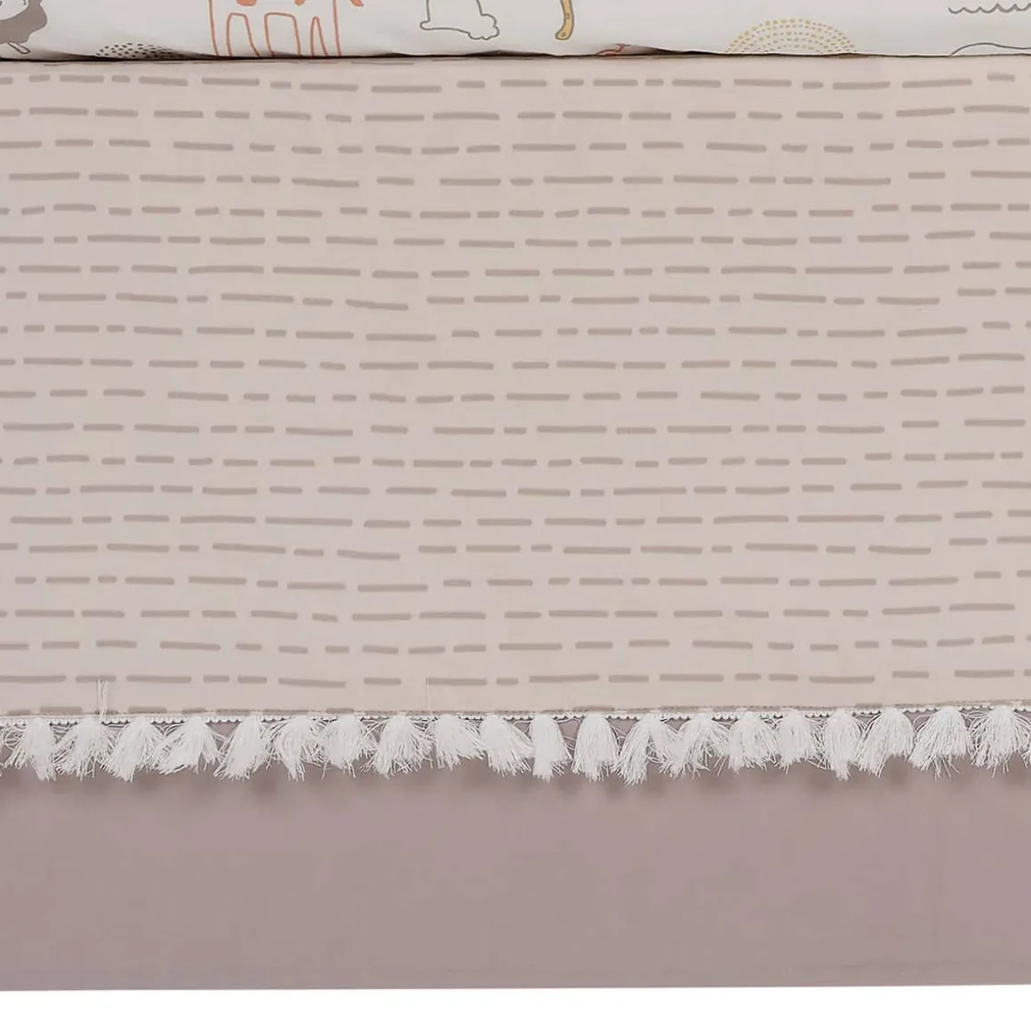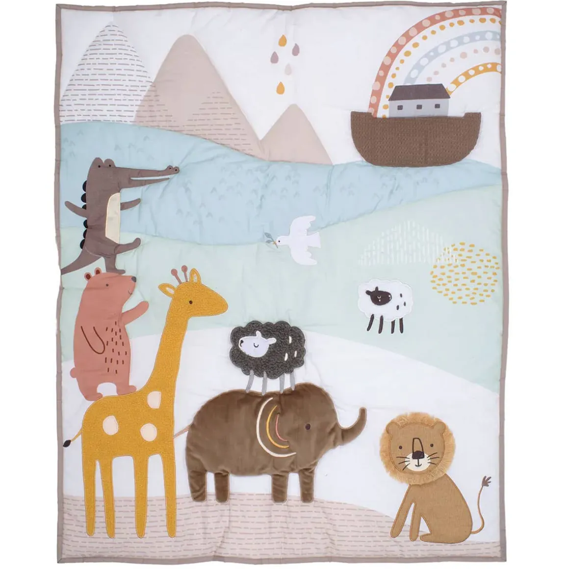 All afloat on Noah’s boat. This three-piece nursery crib bedding set includes one quilt, one breathable 100% cotton fitted crib sheet, and one crib skirt (dust ruffle). Upscale fabrications of minky, boucle, sherpa, velour, woven fabrics and knits were used to create this amazing baby bedding set. Eddie the elephant is appliqued in taupe velour and has a cute furry textured sherpa sheep standing on his back. Leonardo, the lion, is appliqued in a textured woven fabric and has a 3-dimensional fringe mane. There are stacked animals on the left side of the quilt that include a tall giraffe made of curly boucle, a friendly bear, and a silly alligator standing with one foot on top of the bear’s head. A white velour dove and a white sherpa sheep add to the fun. In the distance is Noah’s Ark made in a thermal knit along with majestic mountains. The breathable 100% cotton fitted crib sheet features giraffes, bears, rhinos, lions, elephants, sheep, alligators, whales , rabbits, and doves. There is elastic all the way around ensuring a safe and secure fit on a standard sized mattress measuring 52” X 28”. The crib skirt adds the finishing touch to your child’s crib. The upper panel features a horizontal taupe dash print on a creamy ground. The lower panel is a coordinating solid taupe with white tassel trim and has a 14 ½” drop.