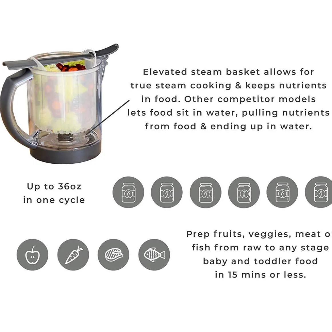 - Steam cook & puree fruits, veggies, meat or fish from raw to any stage baby and toddler food in 15 mins or less