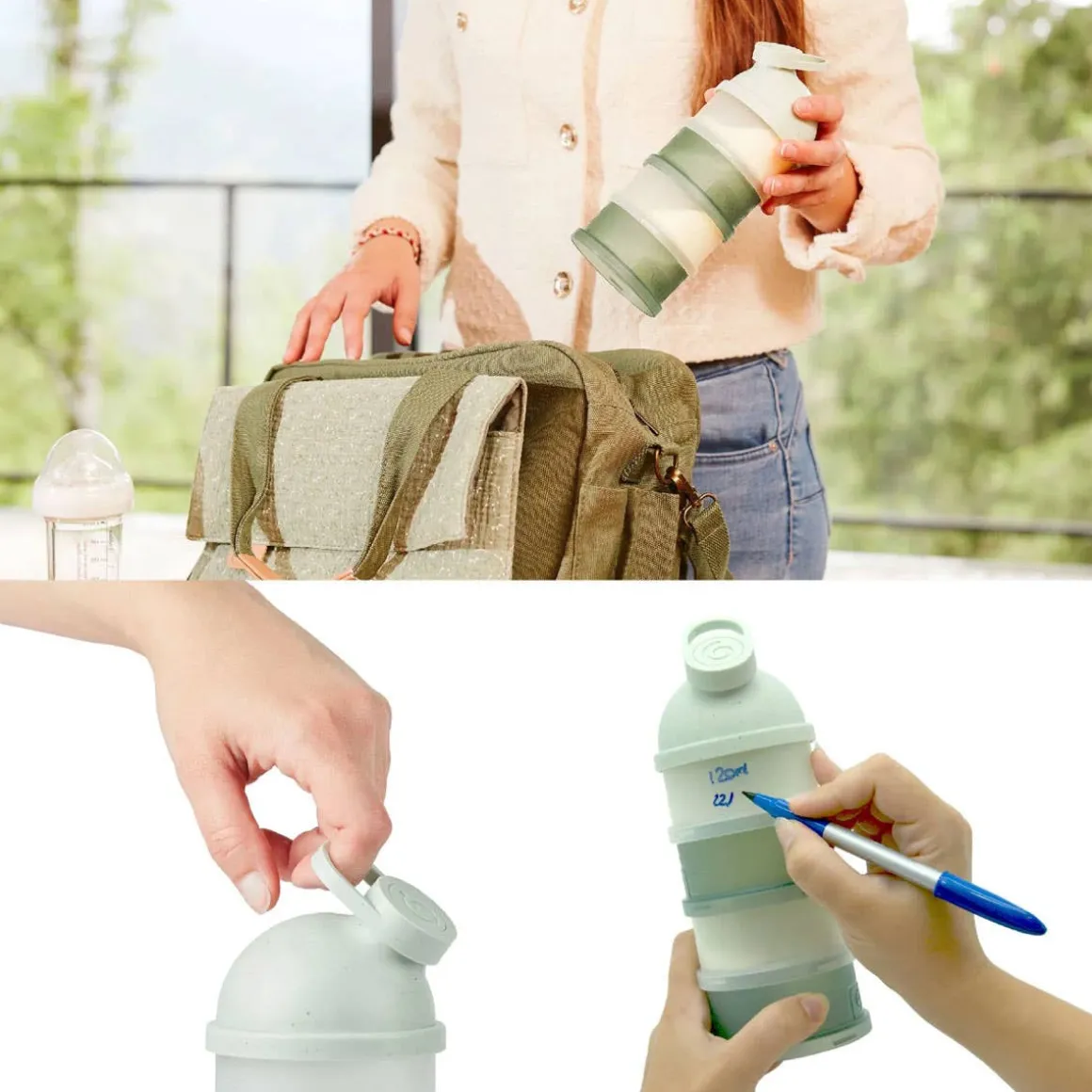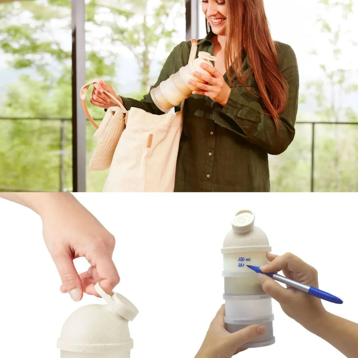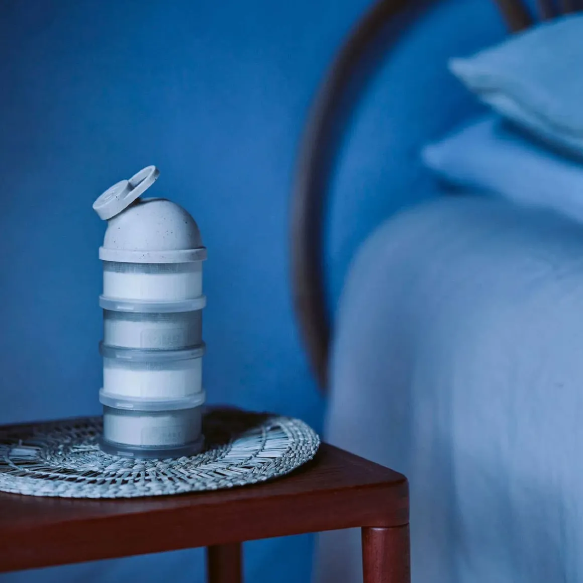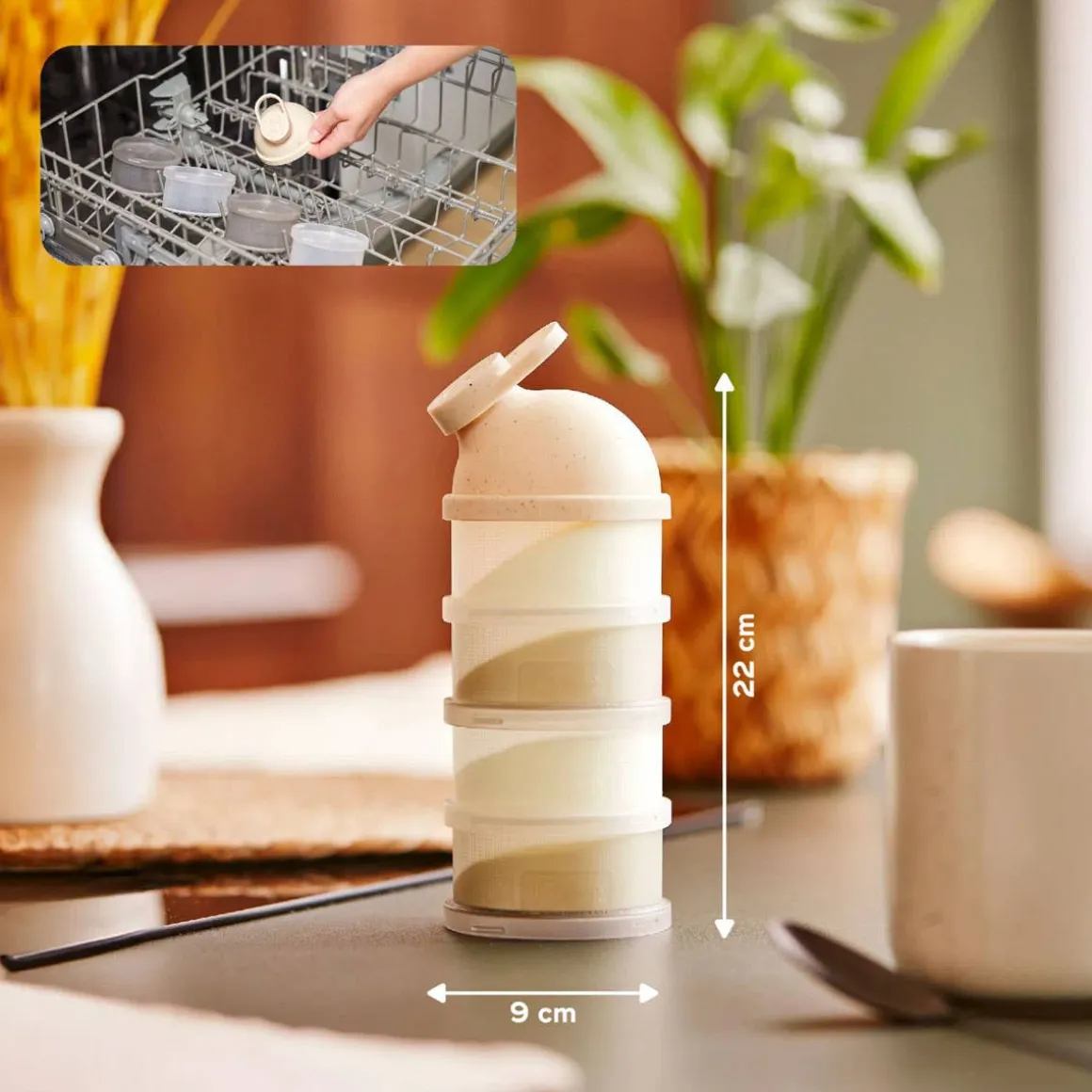 The ergonomic spout of the Babymoov milk powder dispenser prevents residues and spills. It has four transparent compartments in two colors, hermetically sealed and with a transparent surface to see the contents at a glance and save time. Each compartment has space for 12 scoops of milk powder, which is enough for baby bottles up to 360 ml. The compartments are practical and easy to hold thanks to their grippy texture. In addition, the milk powder dispenser is easy to transport thanks to the handle on the cap, which you can hook a finger on or attach to a clip to take it anywhere. It is made in France with regional producers, although production has been relocated domestically compared to the previous model. This product is versatile and is also suitable for storing small snacks. It is easy to clean in the dishwasher and is suitable for the sterilizer. It is also available in two colors that match other products in the collection.