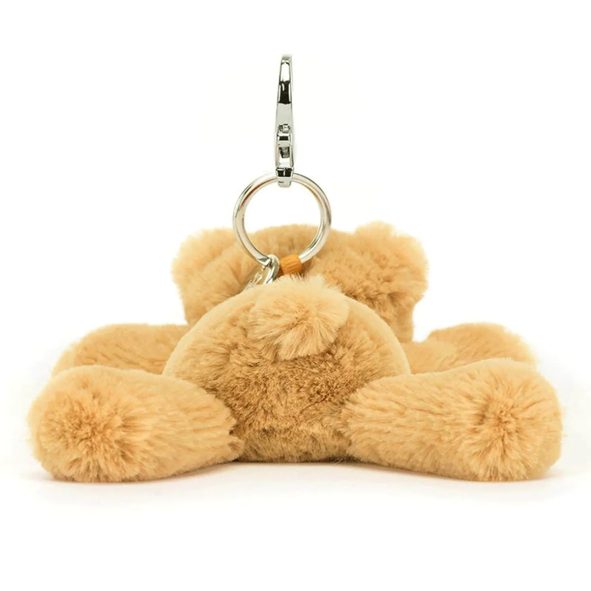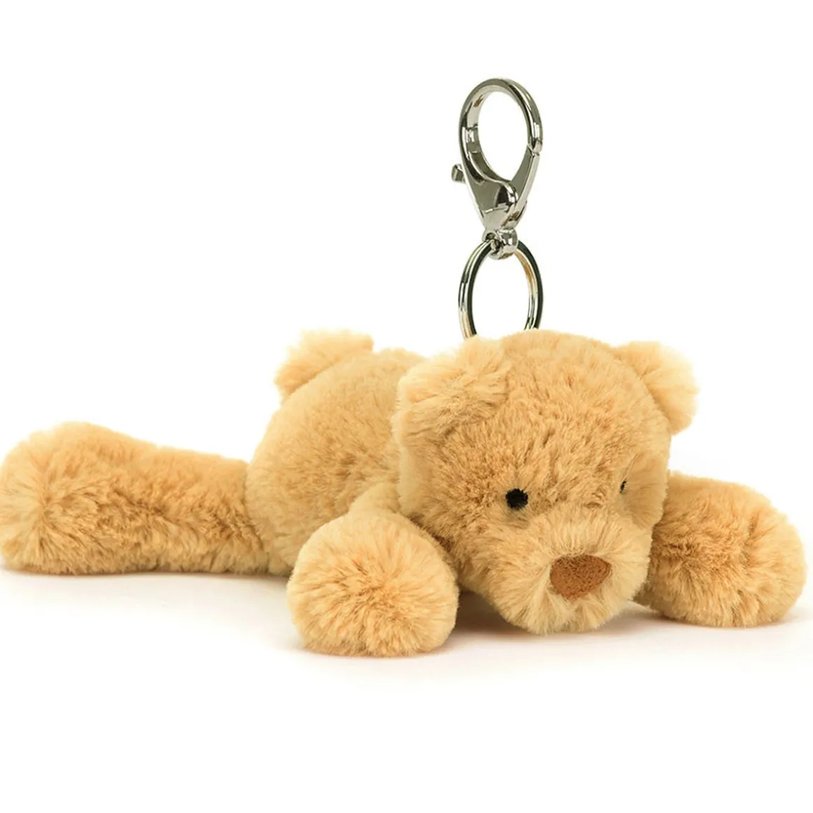 Classically sweet in warm golden fur, the Smudge Bear Bag Charm brings any bag to life. Beautifully soft, with holdable paws, embroidered face and bobble tail, this bear clips on with a silver claw and matching Jellycat tag.