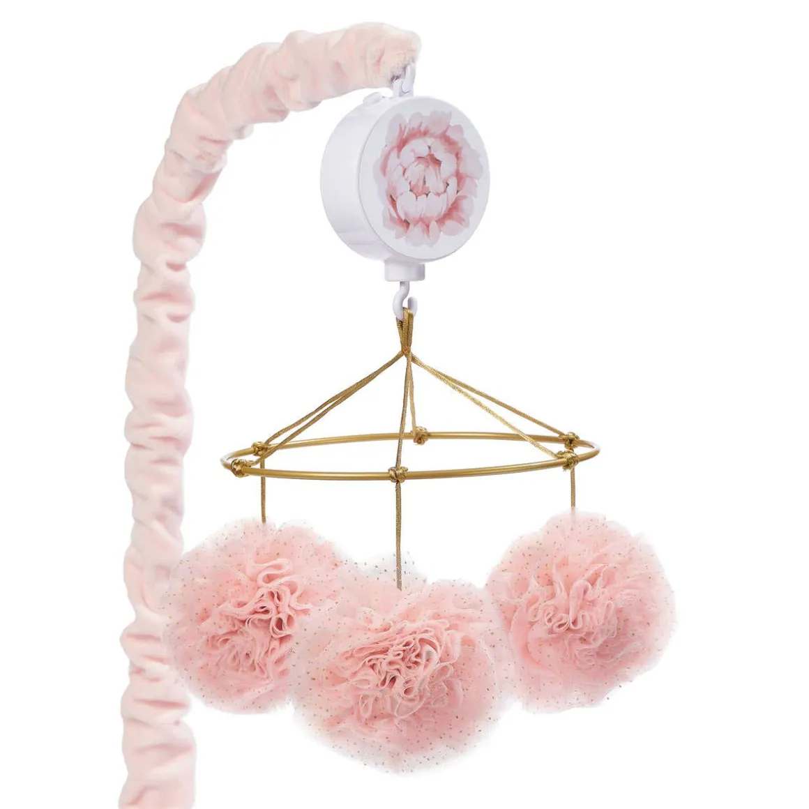 This Ballerina Baby charming musical mobile features 3 large tulle pom pom style flowers with Metallic gold flecks and Metallic gold ring. All the flowers are approximately 3 – 3 1/2” in diameter, have laser cut petals gathered in approximately 30 layers. The scrunchie which covers the mobile arm is in a pretty light pink velour. The mobile plays nursery songs for 20 minutes, has an on/off switch and volume control. It rotates to the music of Brahms Lullabies. Requires 3 AAA batteries not included.
