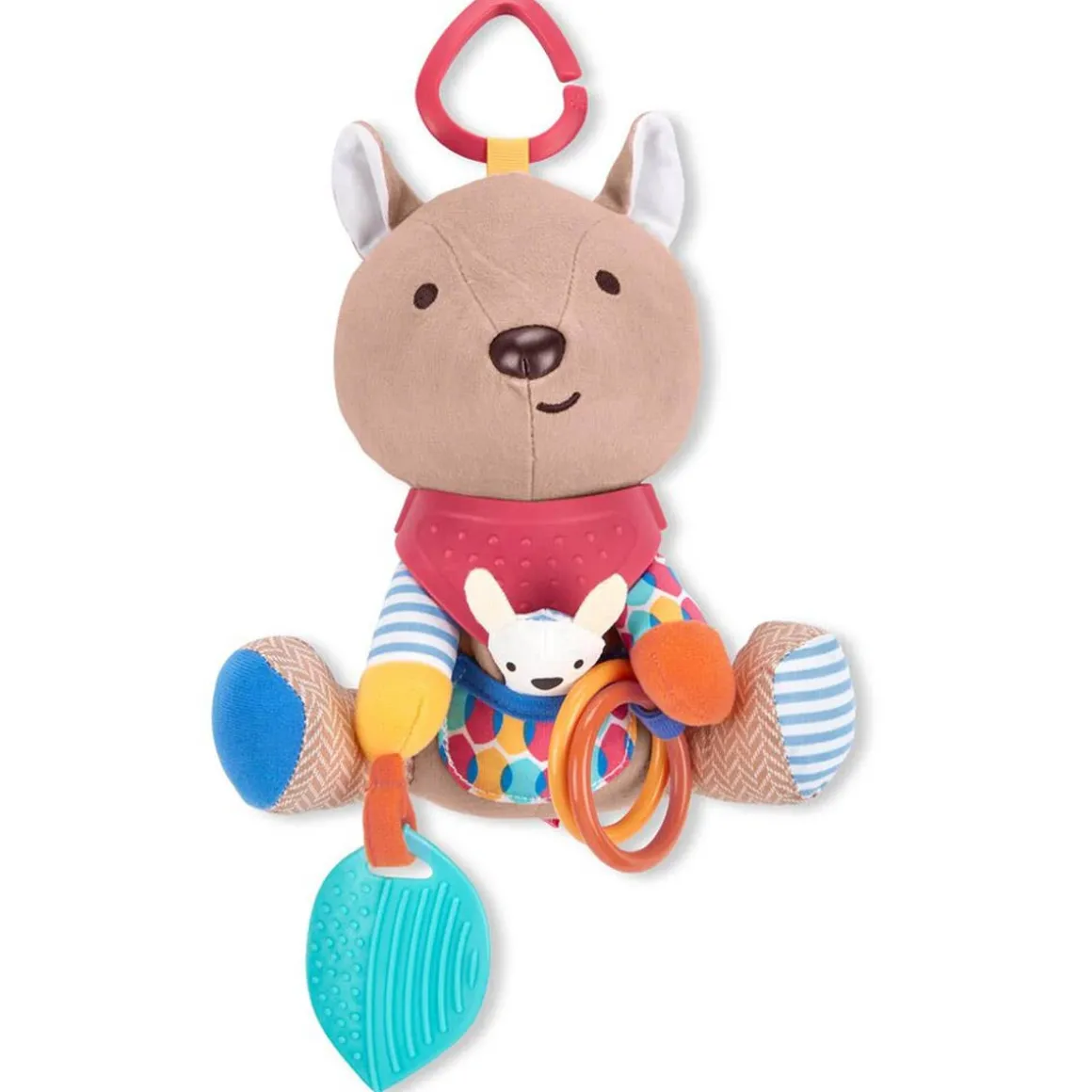 Full of textures, patterns and sounds, little hands stay active as baby explores rattles, crinkles and more. This colorful character’s soft bandana teether detaches for mom to wear around her wrist for quick access. Perfect for multi-sensory play, this cute companion is ideal for fun at home or-on-the-go.