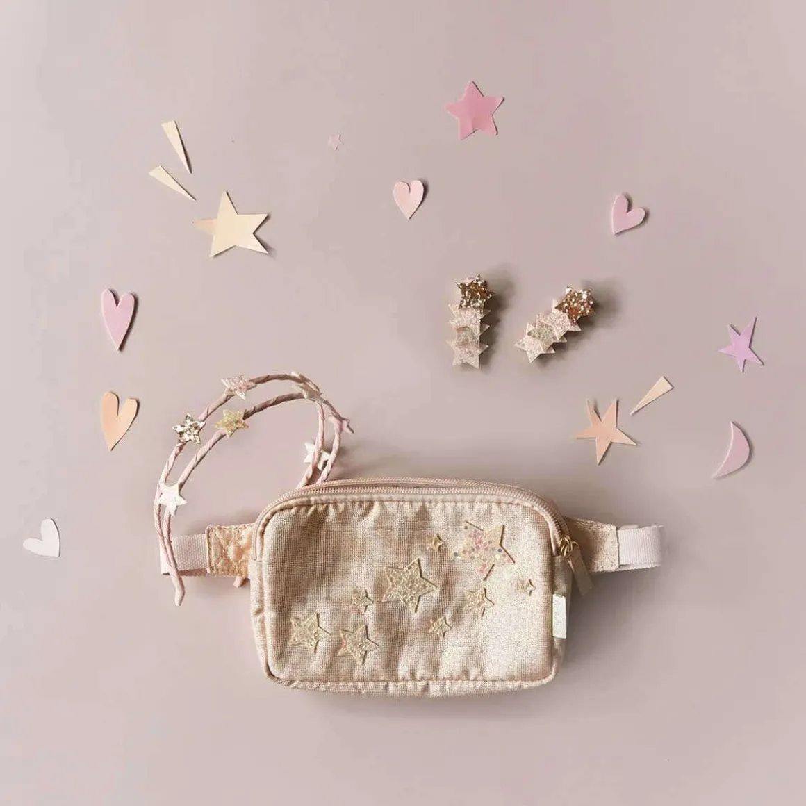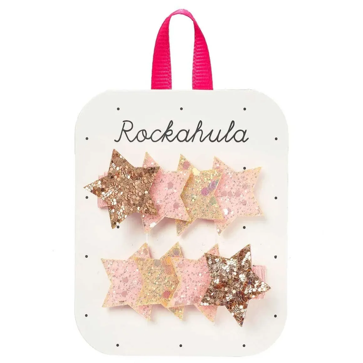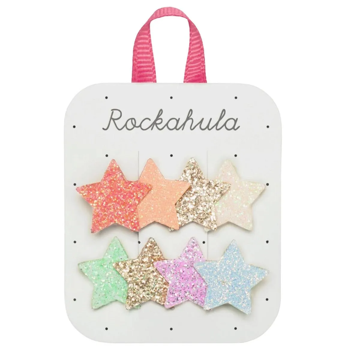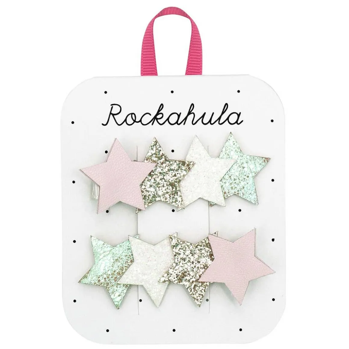 Two salon bar clips covered in grosgrain ribbon, adorned with a glistening row of pastel and iridescent coloured stars. Perfect for adding a touch of elegance and shimmer!