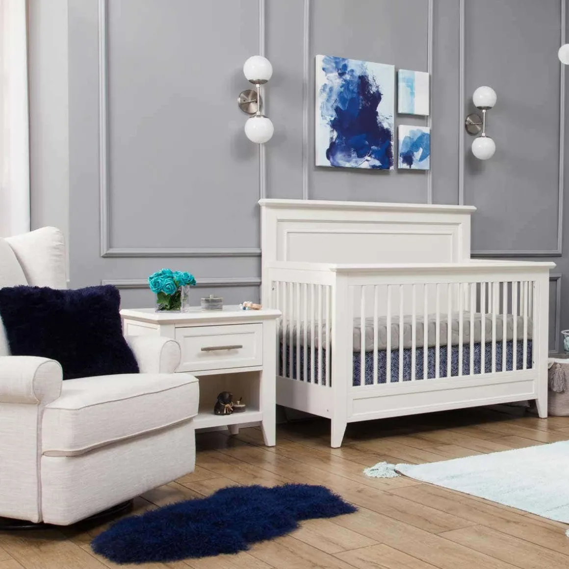 The Beckett Nightstand features the same simple tapered feet and contemporary 45 degree trimming to complement the Beckett 4-in-1 Crib and Beckett 6-Drawer Dresser. With its raised drawer panel molding and an open shelf for extra storage, the Beckett is a transitional piece fit for any setting. The dovetail construction drawer is fully extendable with self-closing, ball bearing glides.