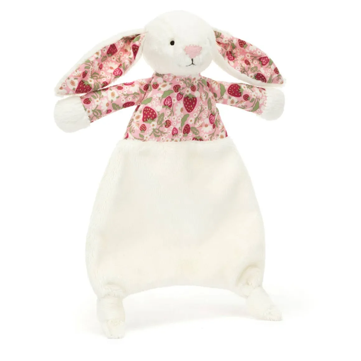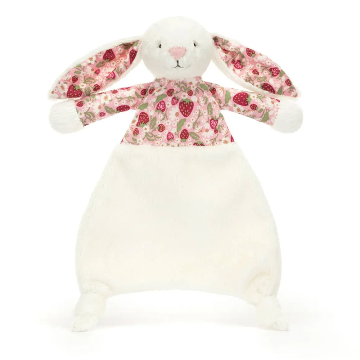 Irresistibly soft in a cream colored fur made from recycled fibers, with strawberry patterned ears in an original Jellycat design, Blossom Cream Bunny ‘Berry’ Comforter features Jellycat’s beloved Bashful Bunny signature long lop ears, a pink suedette nose and embroidered eyes. Designed with an un-stuffed body yet delicately squashy paws and bobble feet, making it easy for little hands to grab hold of and comfort themselves.