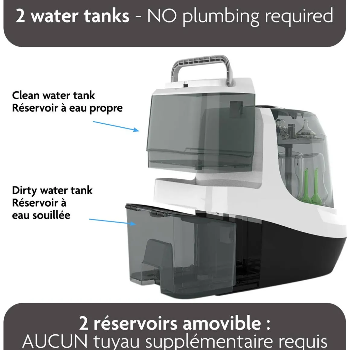 - No Sink Hook Up Required and Easy to Use: No messy drain hoses. Includes removable clean and dirty water tanks so you can use anywhere in your house; Built-in wheels for easy turning; LCD Control Panel. Includes replaceable HEPA filter