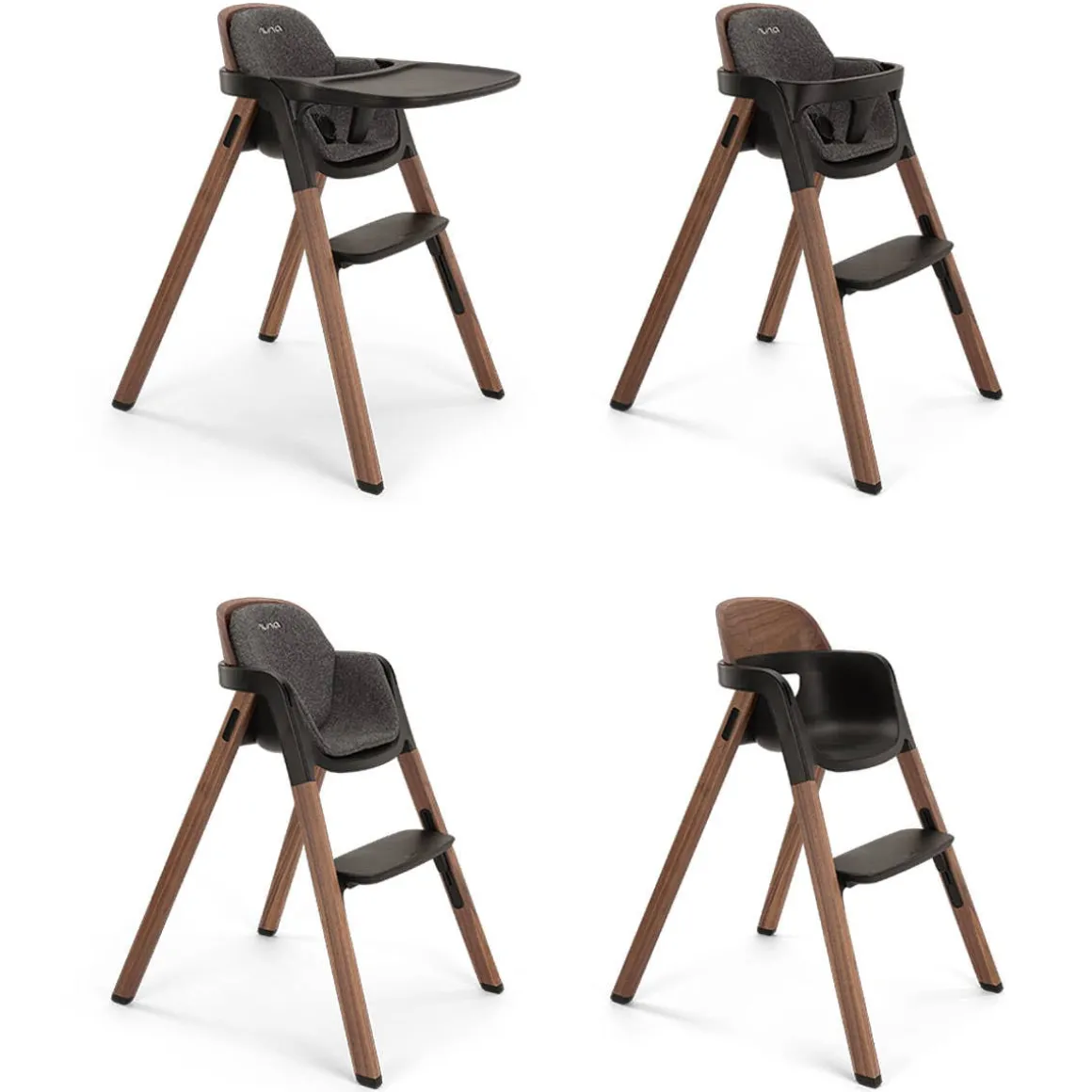 - Meticulously crafted to blend naturally with the contemporary family home. Wooden leg and backrest accents create a perfect balance of style and warmth. Each high chair presents an organically unique wood grain and hue, making makes it a one-of-a-kind statement piece.