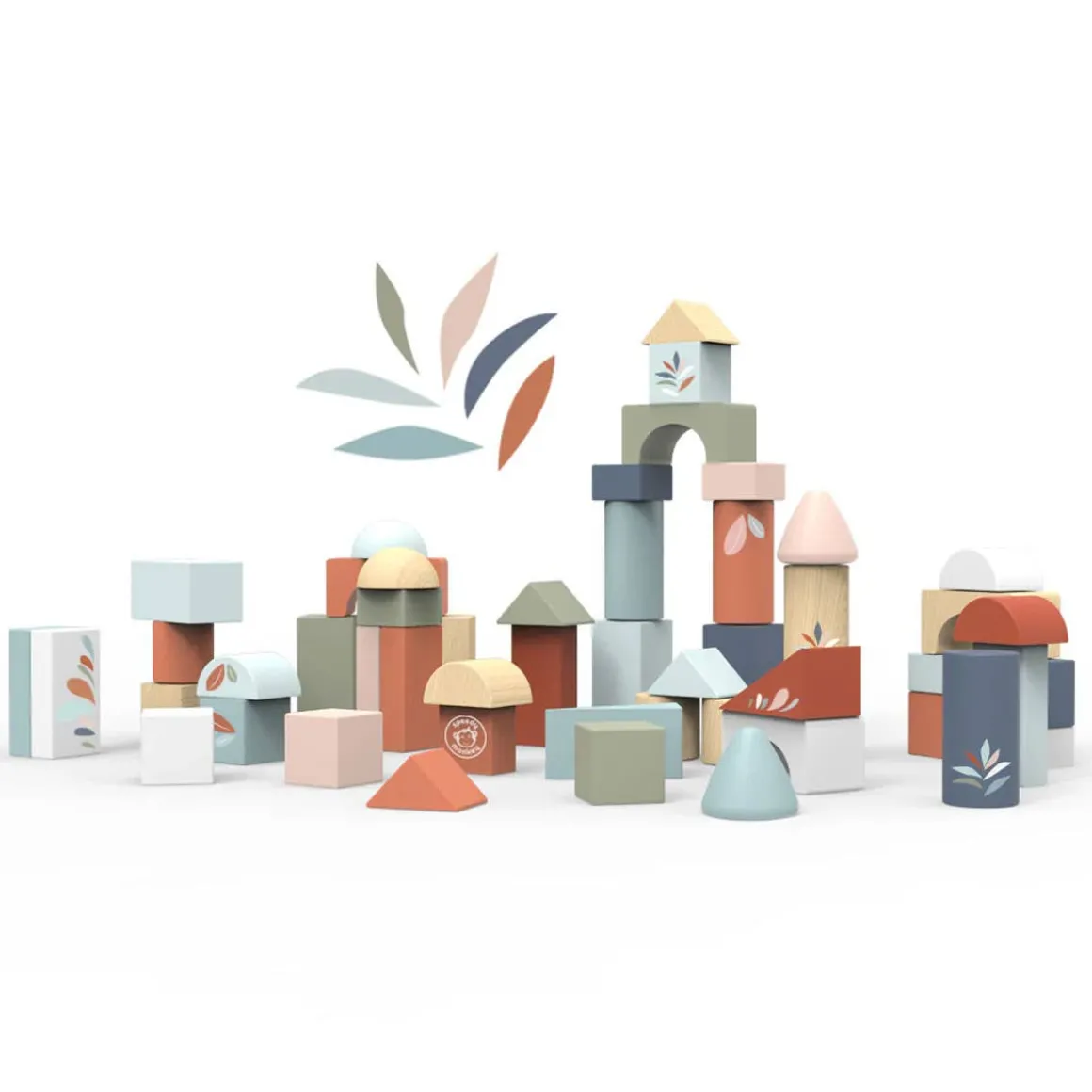 50 Colorful wooden building blocks for toddlers, remains indispensable for apprenticeship hand-eye coordination. Different shapes and printed with pretty leaves encouraging your little one to freely use his imagination to build while stimulating sensory development. The blocks come in a pretty round bucket a handle and with a shape sorter lid which makes it more fun to collect them. This toy is crafted from sustainably sourced wood from FSC® certified forests. Presented in a beautiful gift box.