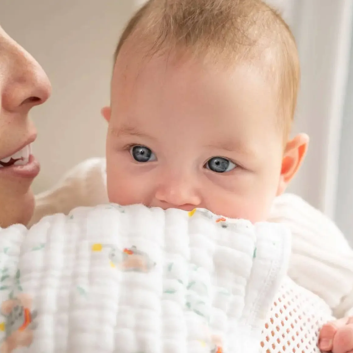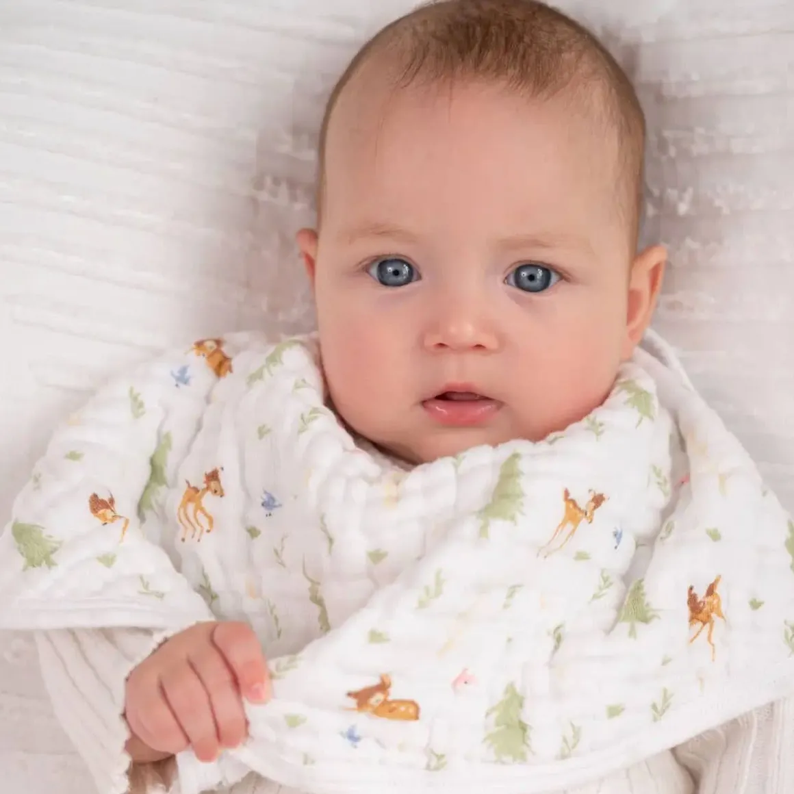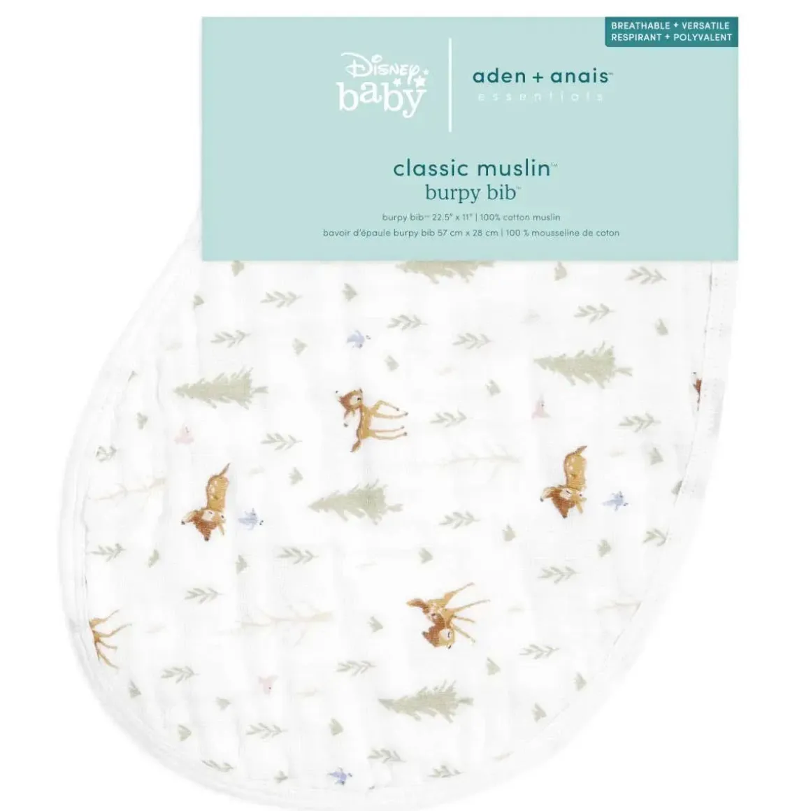 Made with 4 layers of absorbent muslin, Aden & Anais lightweight Essentials cotton muslin burpy bibs are a necessity for everyday messes. This patented design lets you snap around them as a full coverage bib, or drape over your shoulder for a no-slip burp cloth.