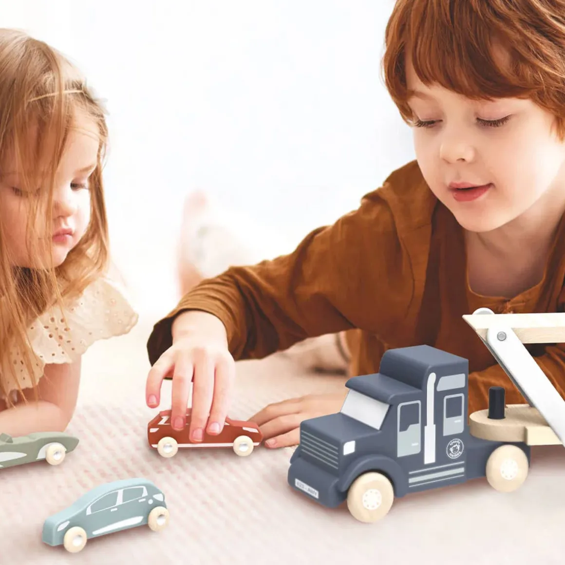 This wooden car transporter truck toy has a double-deck trailer. It easily converts for loading and unloading. Four colorful assorted models of solid wooden cars are included with the trailer. Slots are designed on the trailer to avoid cars from falling. Your little one can safely race along an imaginary road. While exciting and fun, this toy helps to develop fine motor skills, manual dexterity and creative play. This toy is crafted from sustainably sourced wood from FSC® certified forests. Presented in a beautiful gift box
