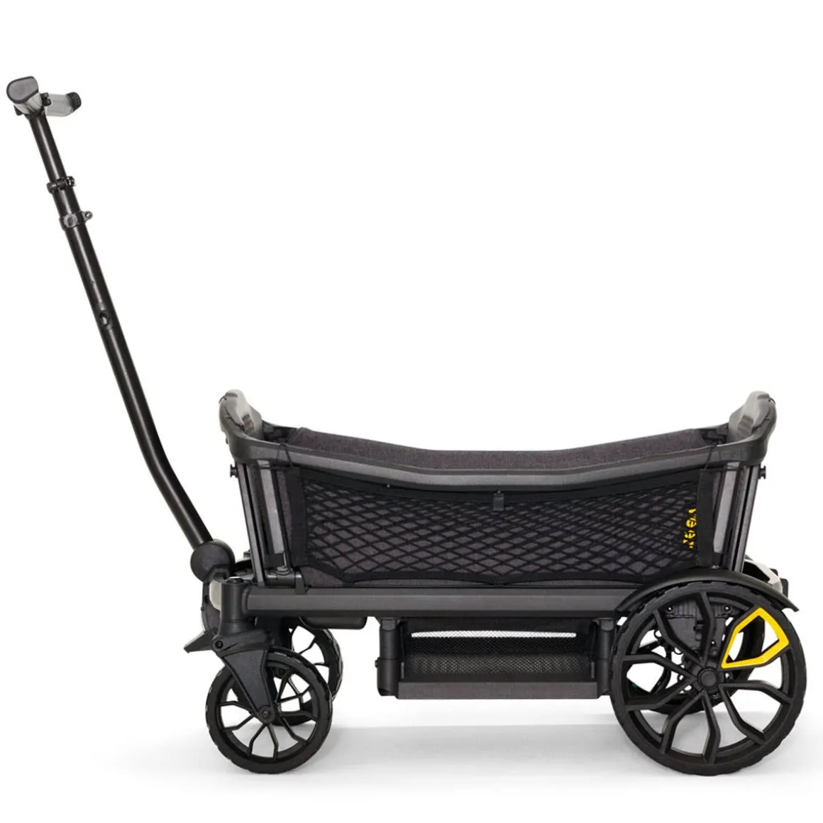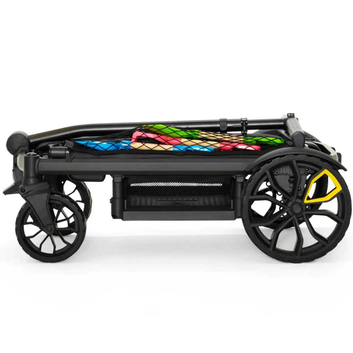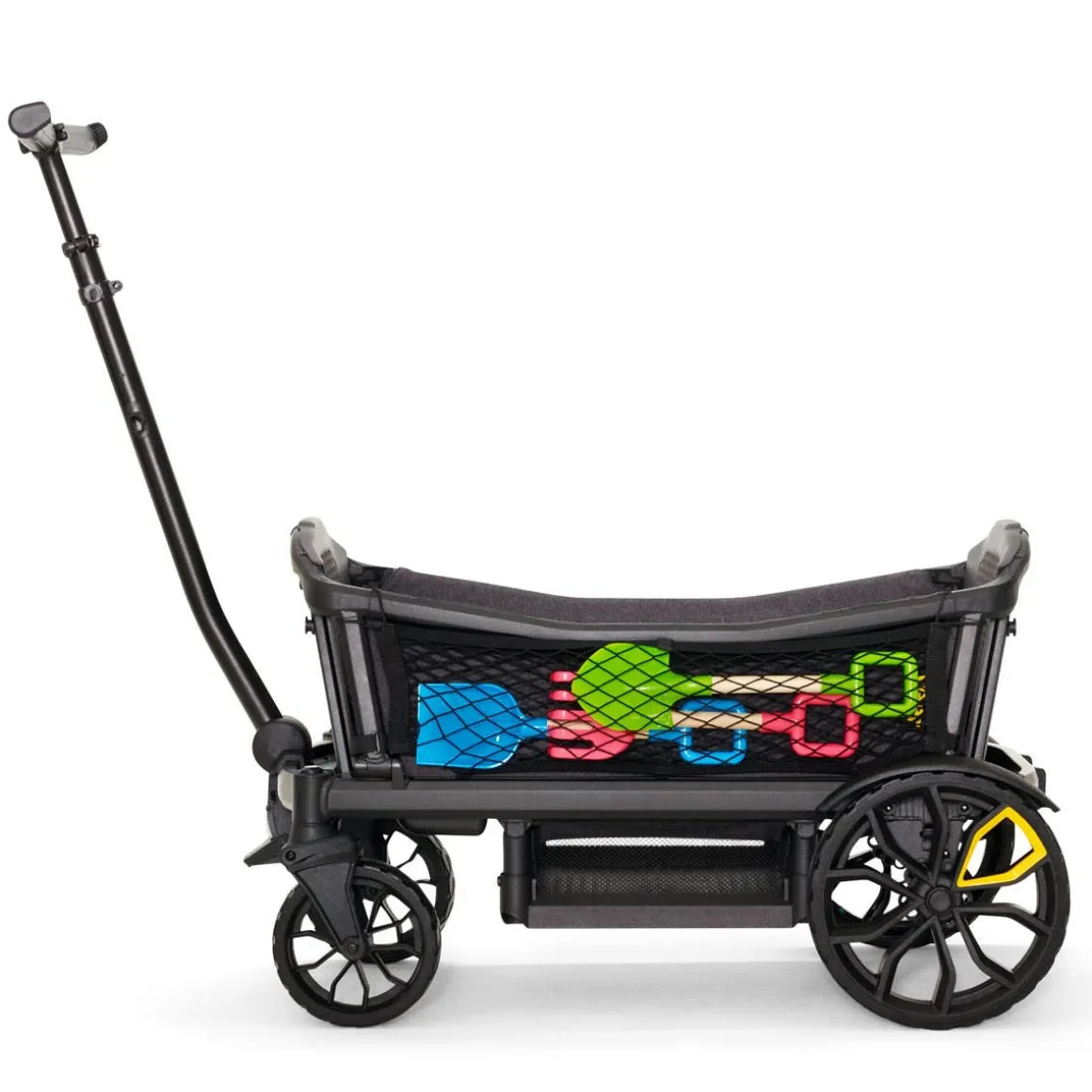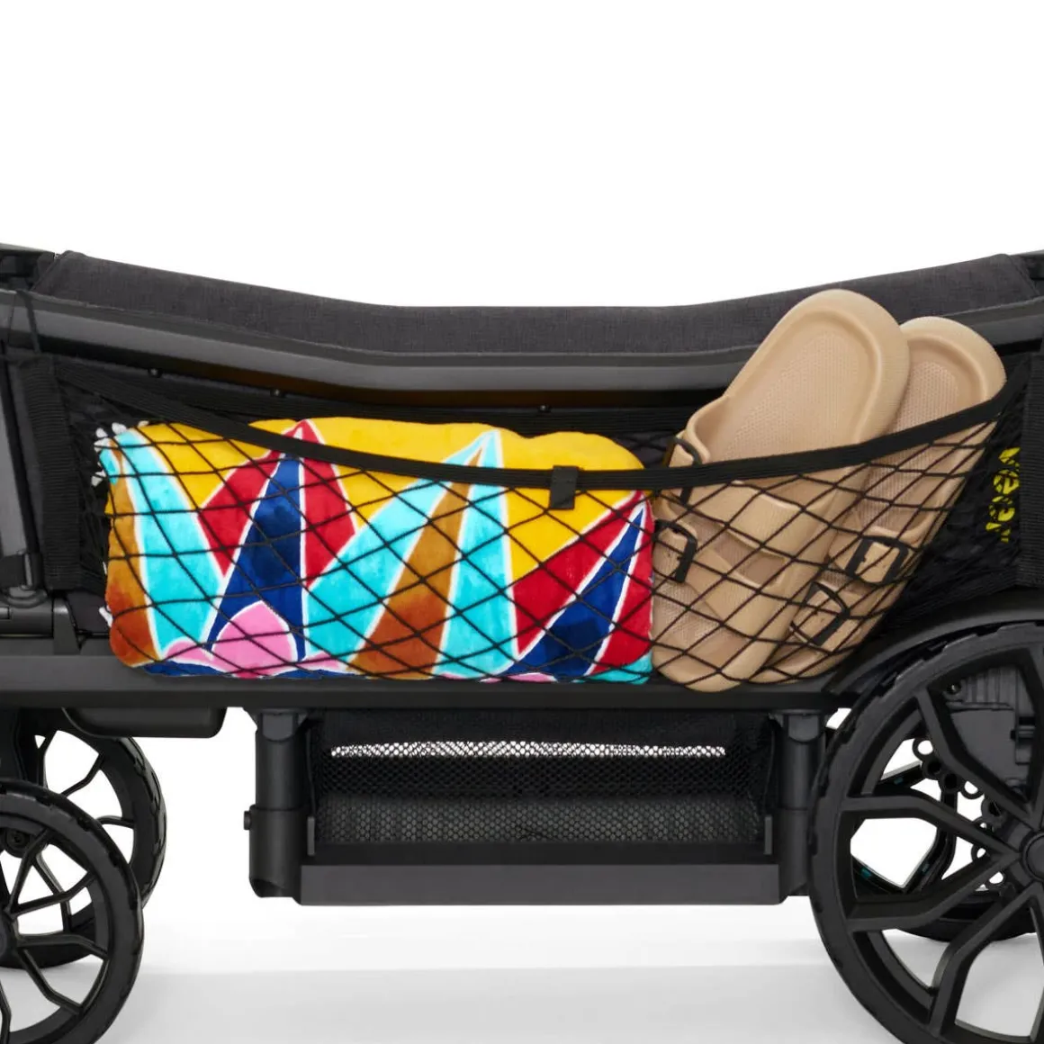 The Cargo Net secures to the Veer Cruiser side wall with two elastic loops on top and two Velcro sinch straps at the bottom.