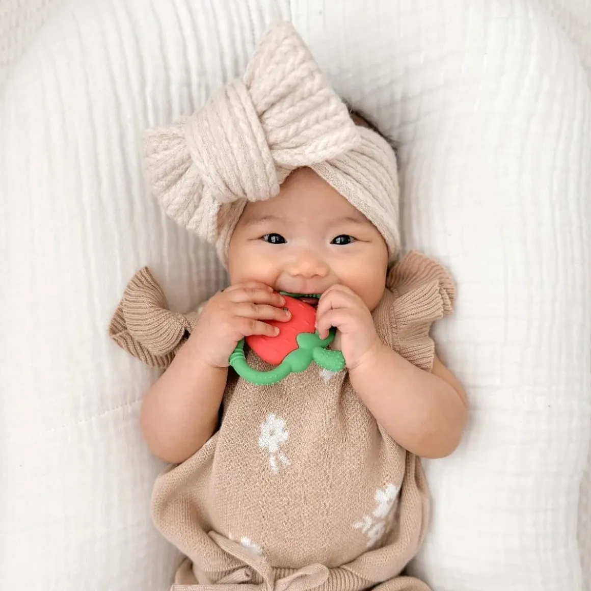 - Adorable silicone teether is designed with easy-grab handles for tiny hands