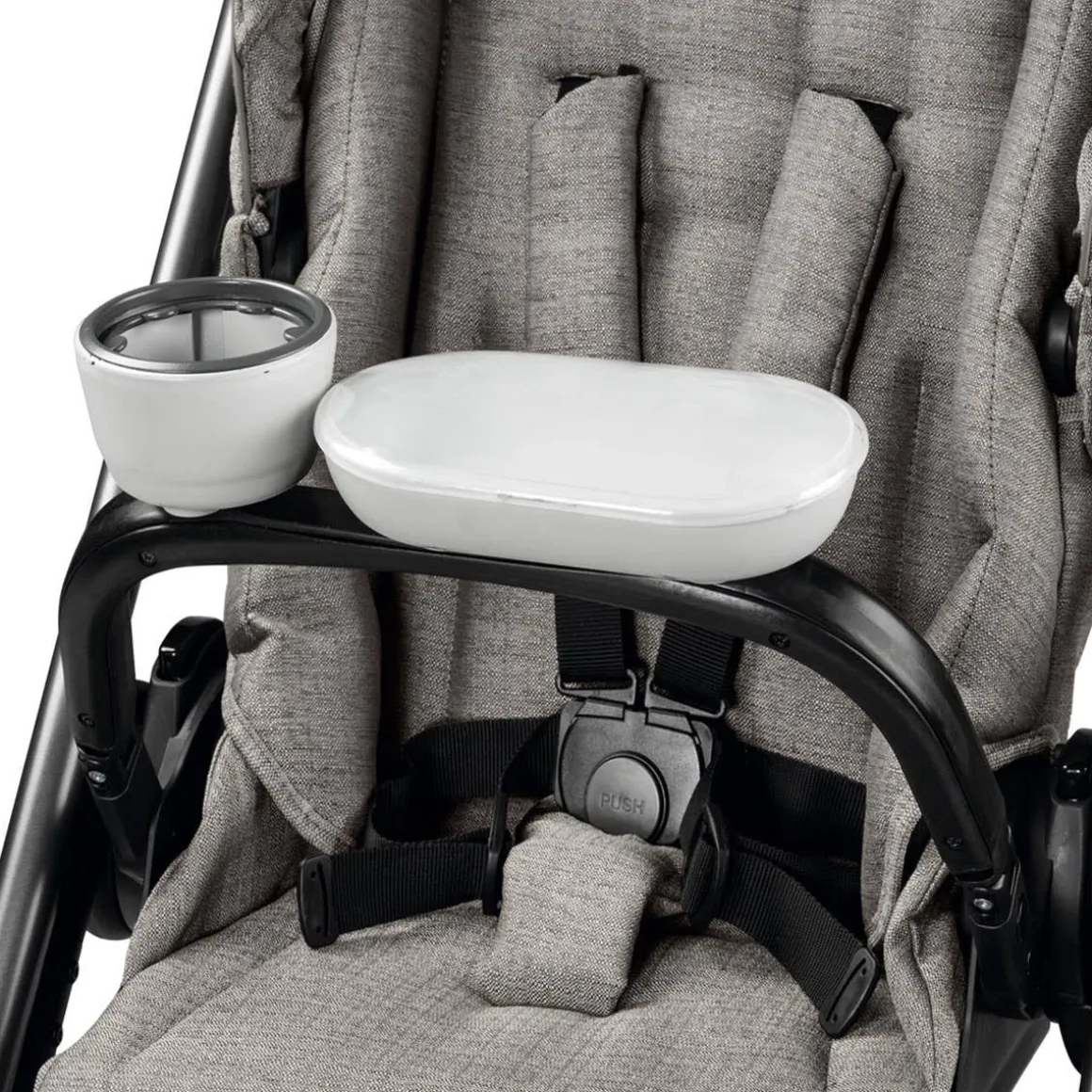 An easily removable front bar with cup holder, so that baby has everything to hand. The cup holder and food container are dishwasher safe