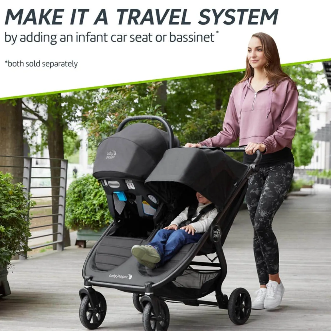 The Baby Jogger® city mini® GT2 Double has an all new design with Forever Air rubber tires and all-wheel suspension providing uncompromised agility on any terrain with two. The signature in-seat fold, adjustable handlebar, and hand-operated parking brake provide you the ultimate convenience while the adjustable calf supports and near-flat seat reclines allow you to find the most comfortable position for your children.