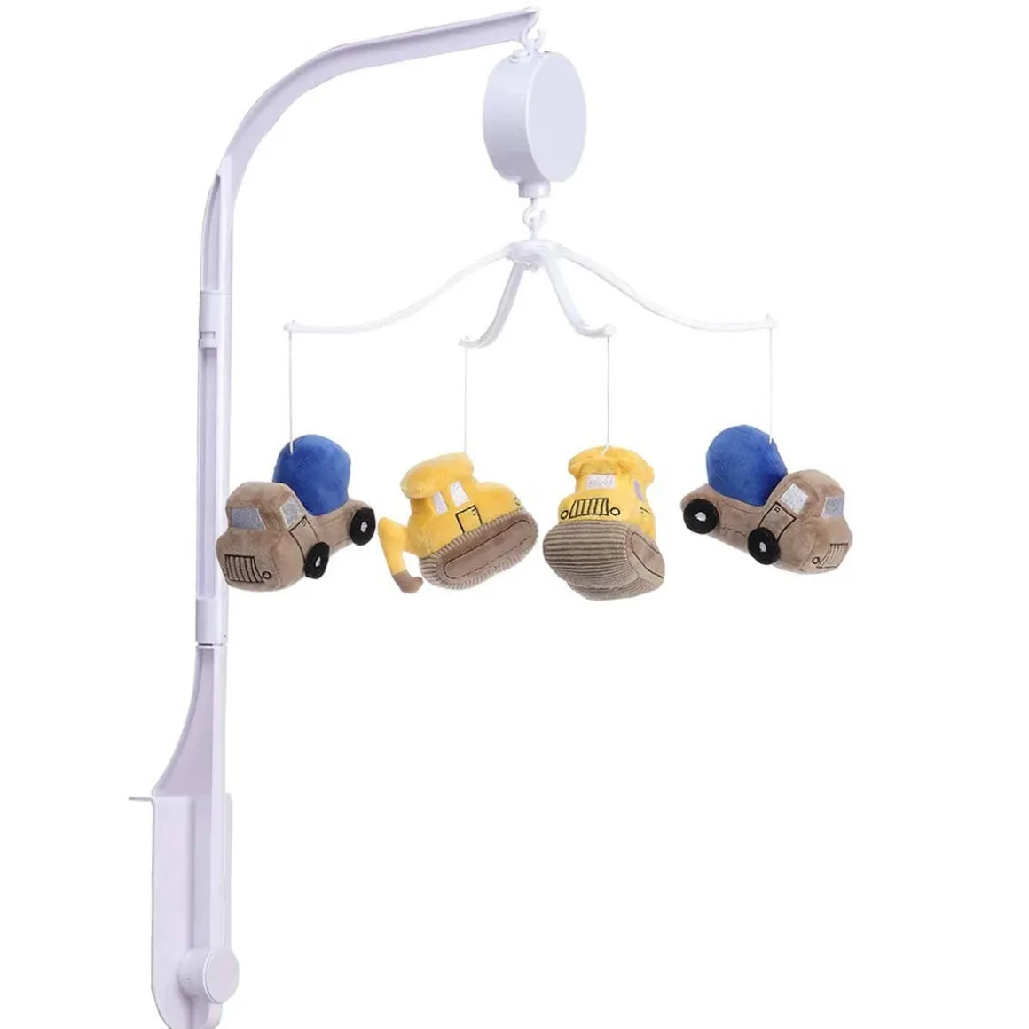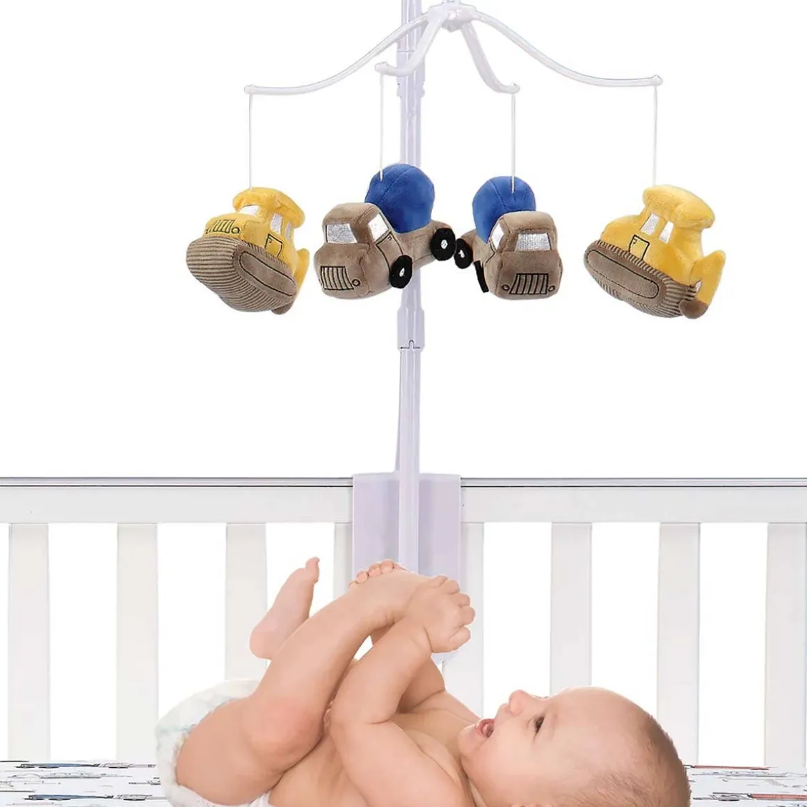This musical mobile features four construction vehicles which are colorful and super cute. Two of the trucks are made in velour with black felt wheels and embroidered windows, doors, and hood, and two are made with corduroy, velour, along with embroidered details. The mobile plays nursery songs for 20 minutes, has an on/off switch, and volume control. It plays Brahms Lullaby, Twinkle, Twinkle Little Star, and Rock-a-Bye-Baby. It promotes visual and auditory development and helps baby self-soothe. Requires 3 AAA batteries not included.