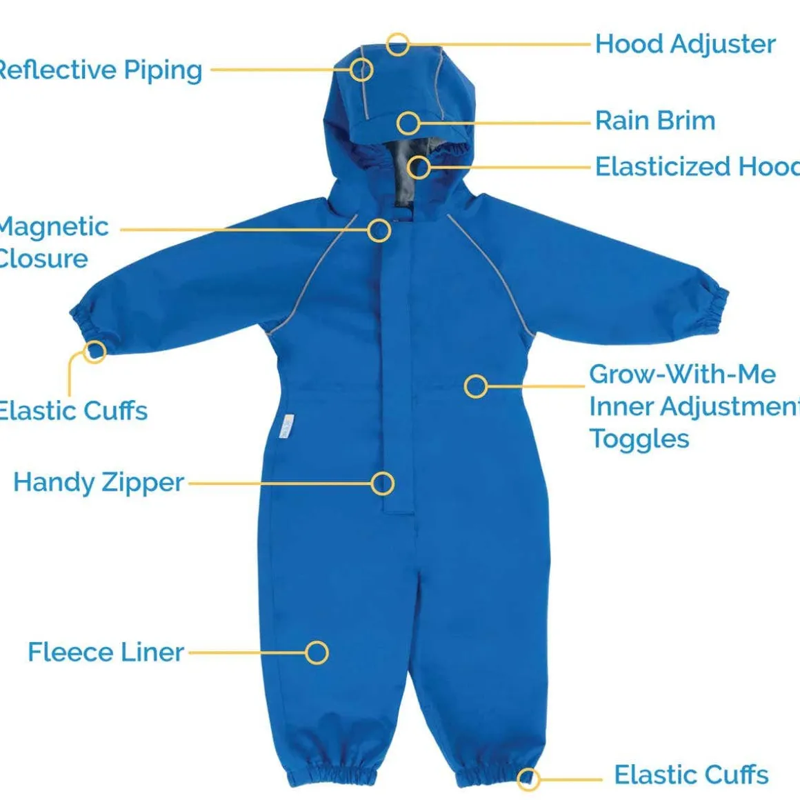 - Gro-With-Me®: Generously sized with adjustable hood, waist, and elasticized cuffs