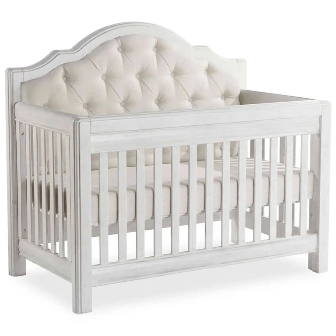 The Cristallo Forever Crib is an enchanting blend of classic lines paired with sweet touches of sophisticated luxury. The strong, clean design of this crib is highlighted by the layered moldings that frame both the front and the headpiece. These beautifully rounded layers provide texture and a nod to the elegance of classical architecture. Set in the headpiece of the crib is a sumptuously tufted panel. Providing a distinct sense of playful beauty, this sweetly textured cushion is designed with both style and use in mind.