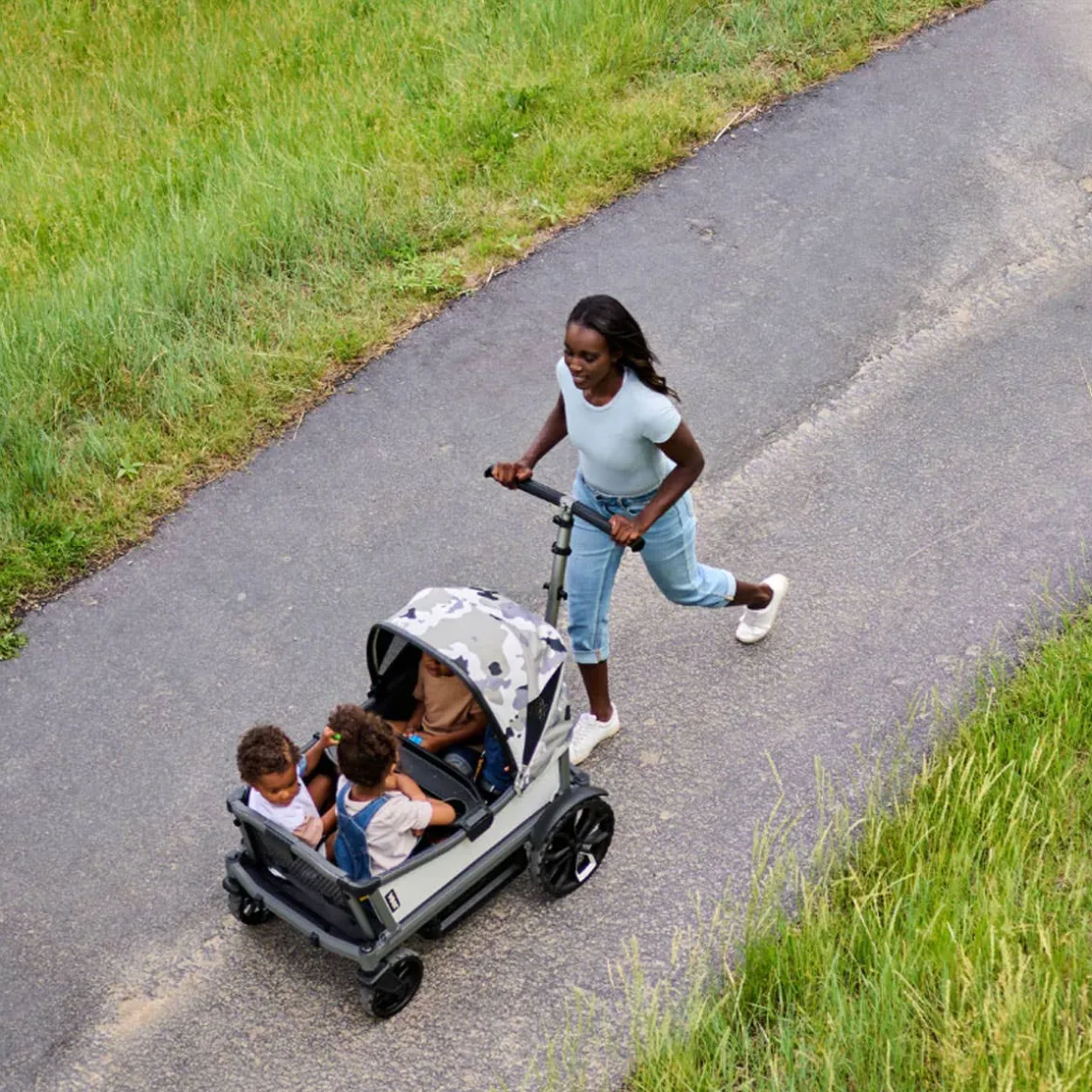 Cruiser City XL gives your family the fun and all-terrain versatility of a Cruiser but offers push steering and ample kickspace of a traditional stroller. Cruiser City XL is perfect for families that love to push on sidewalks, paths and through local attractions with seating for 4. Cruiser City XL features swivel wheels furthest from the handle, which enable it to be steered like a traditional stroller when pushing on smooth terrain. But don’t worry, the handlebar can also drop into wagon mode for pulling over uneven terrain. All Cruiser accessories are compatible with Cruiser City except the Foldable Storage Basket and the Travel Bags.