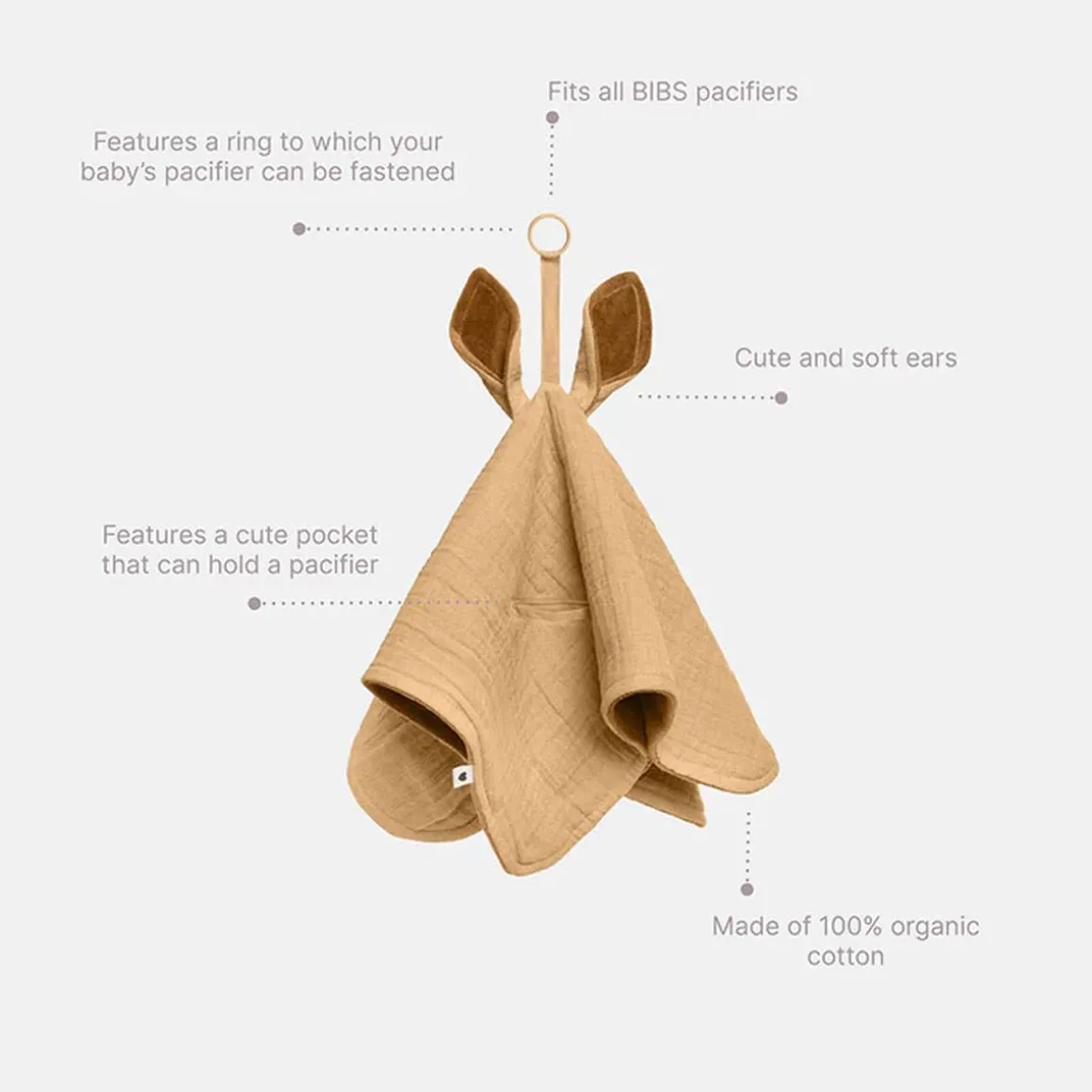 Your baby will love to cuddle with our soft and snuggly cuddle cloth. It is an indispensable essential for babies to provide soothing security and comfort. Our cuddle cloth is made of ultra-soft organic cotton. The cuddle cloth has sweet kangaroo ears and a ring to which your baby’s pacifier can be fastened. It fits all BIBS pacifiers, so your baby always has its favorite pacifier close.