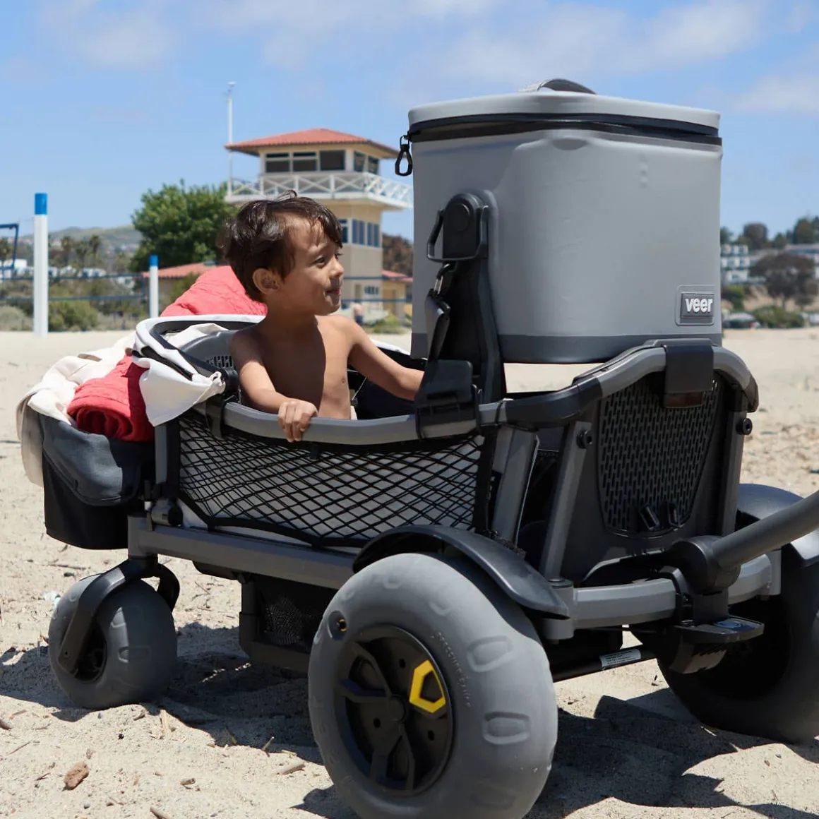 Triple the size of the Lunch Cooler, this 18 liter soft cooler is large enough to pack multiple meals, snacks, and drinks for the entire family, yet lightweight and easy to carry by its handle or padded shoulder strap. Veer’s patented quick release Switchback hubs allow you to quickly snap onto &Roll, &Jog, &Bike, &Chill or Cruiser and snap off by lifting the shoulder strap or handles. Side handles lock the cooler in place when flipped down, and unlock when flipped up.