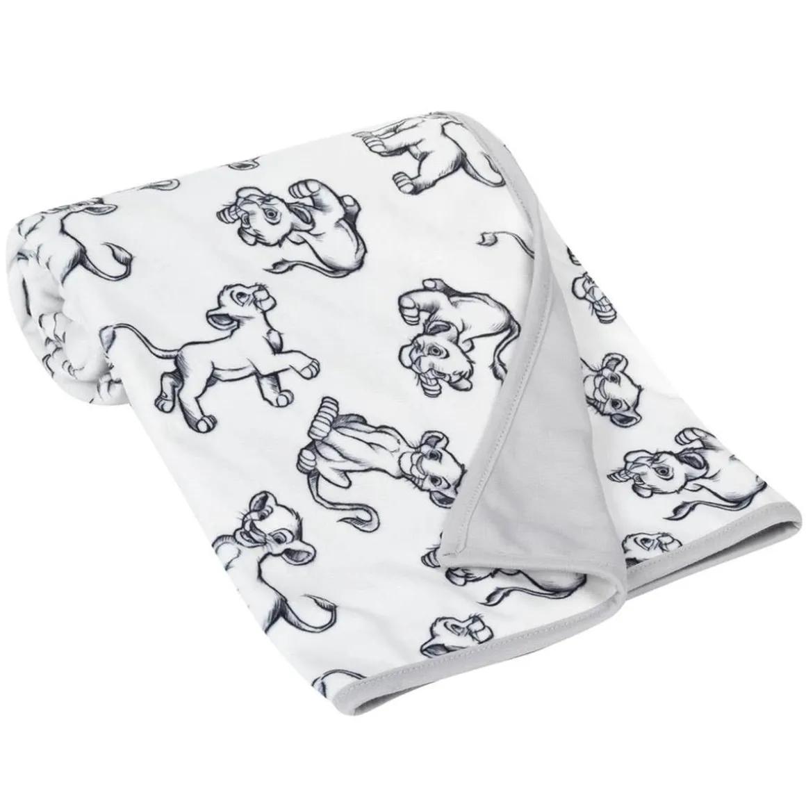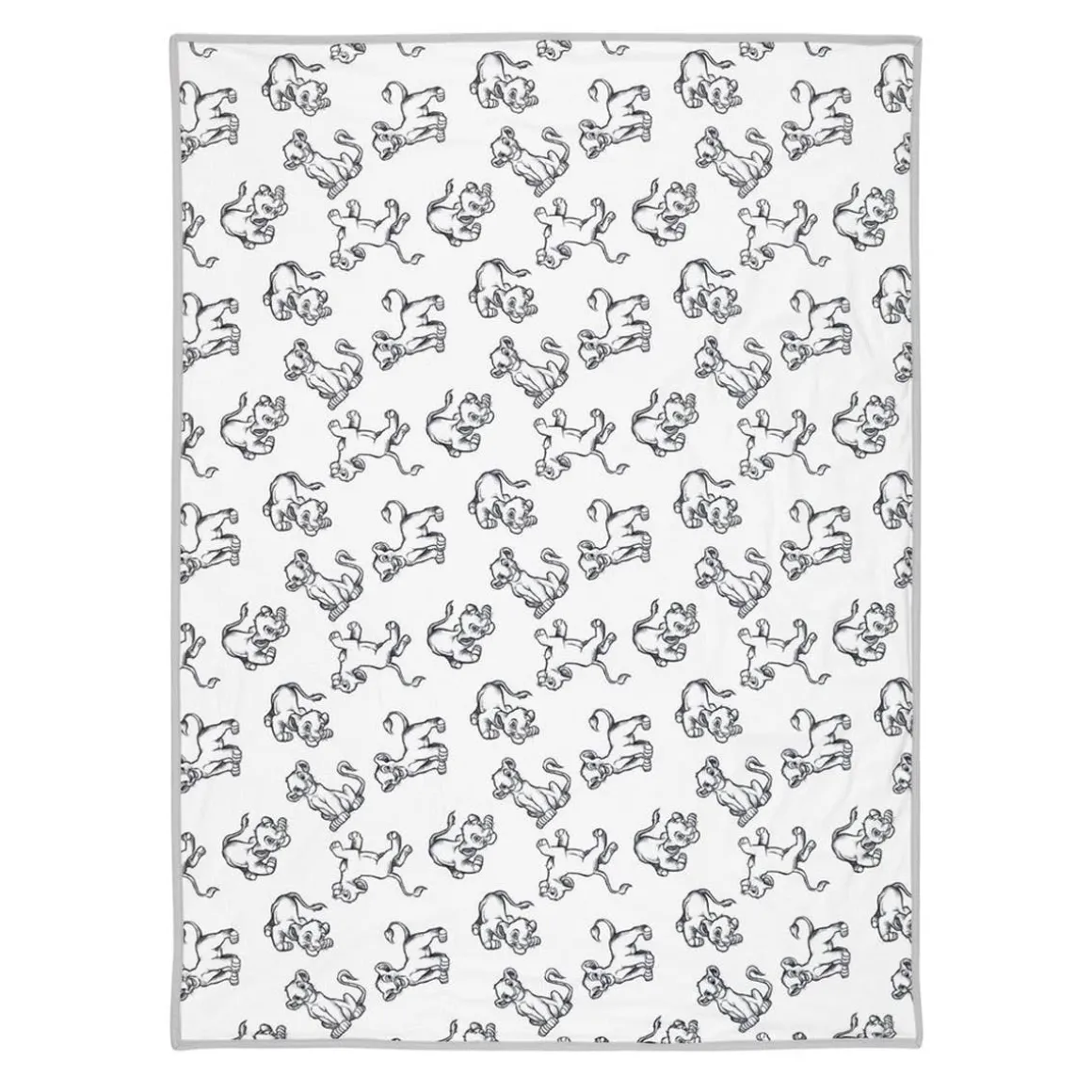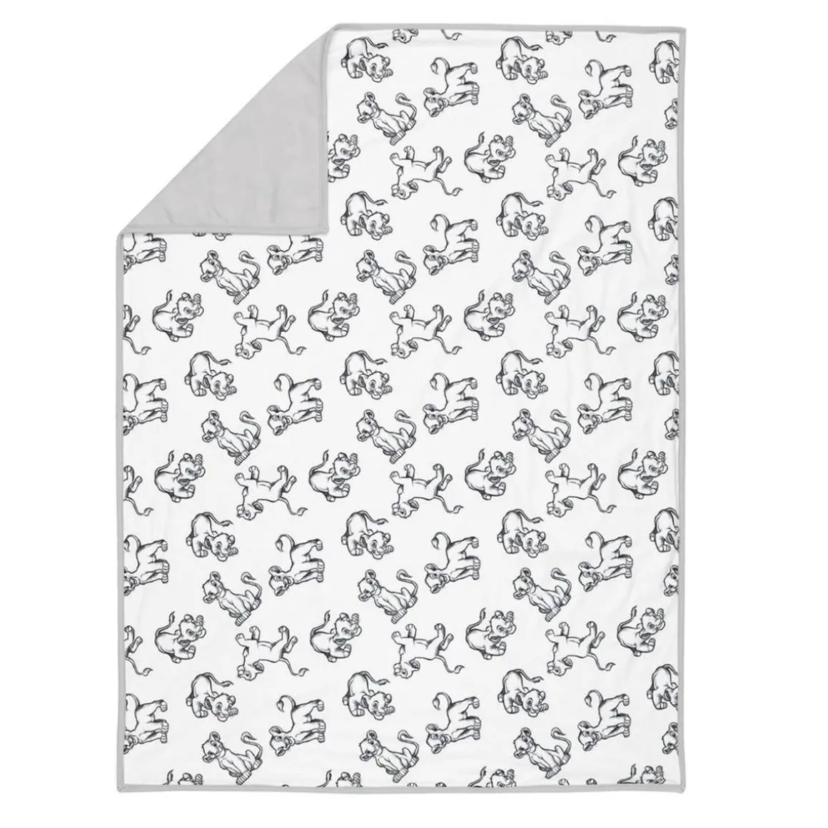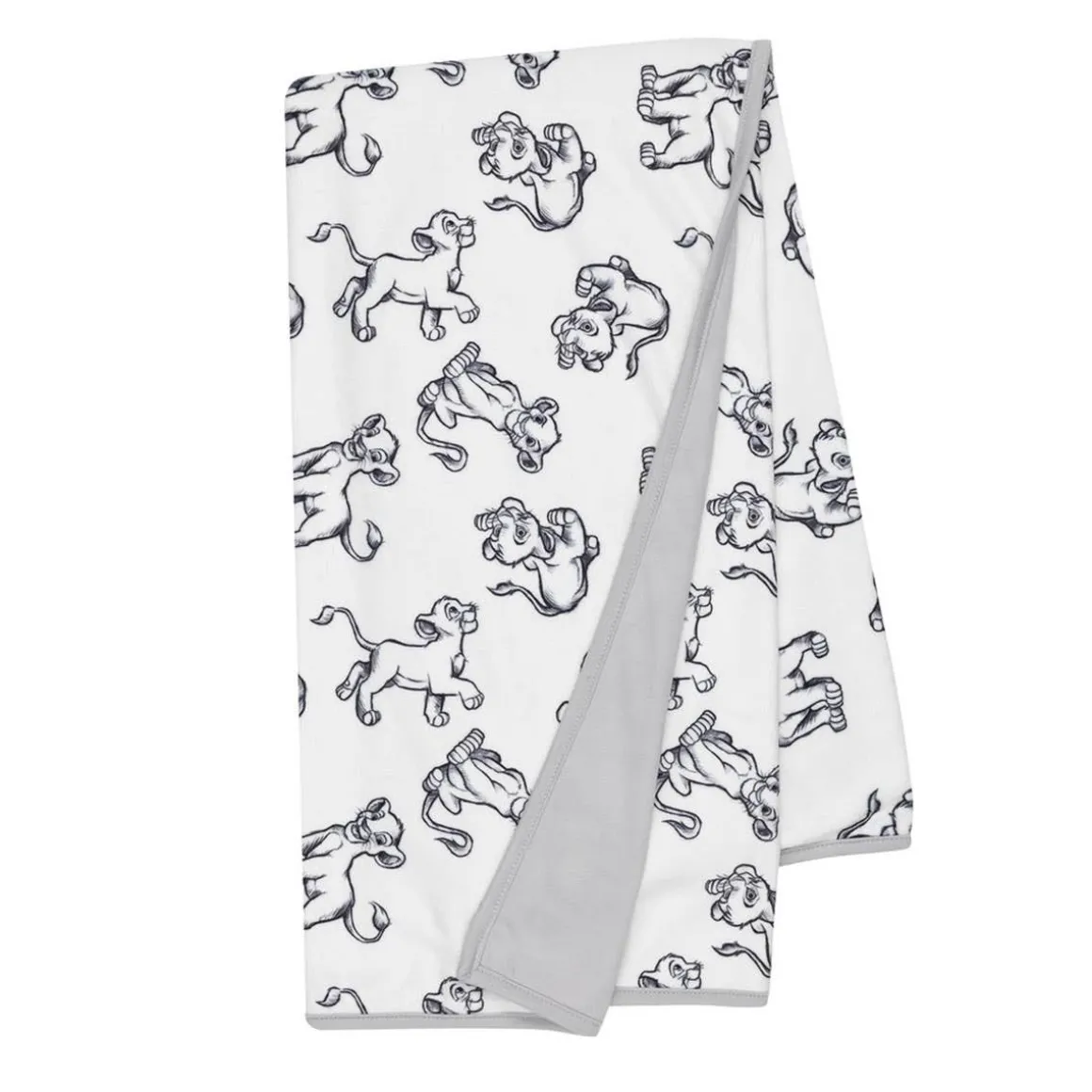 Simba decorates this stylized blanket in a sketching charcoal color. He is sitting, standing, walking and playing. He is on a white minky ground and the back of the blanket is a solid gray cotton jersey blend. This fun, on the go must have blanket is machine washable for easy care. It’s snuggly soft and will keep your little one, oh so cozy. Perfect for baby registry, welcome home, and baby shower gifts.