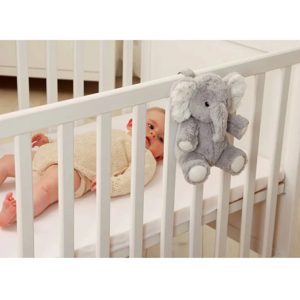 Elliot Elephant On The Go™ comes in a convenient travel size! This fluffy travel companion features four different nature sounds to calm kids and promote peaceful sleep, especially in new environments. And it’s compact enough to clip onto a stroller, or pack into a diaper bag or carry-on luggage.