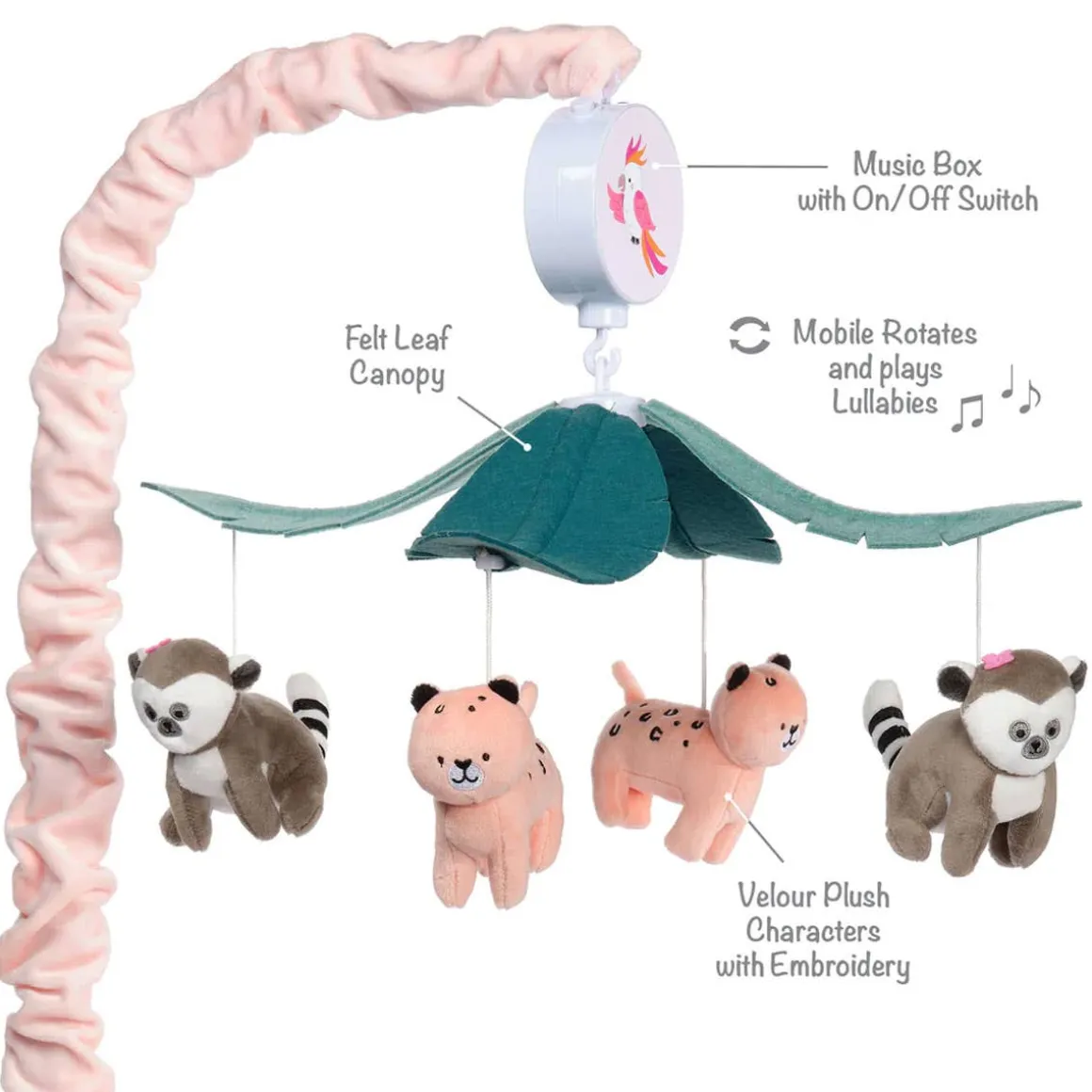 Two mushroom color lemurs and two peachy pink leopards circle around this adorable musical mobile. A canopy of four leaves add to this jungle safari adventure. A light pink scrunchie covers the mobile arm and the music box is decorated with a toucan with colorful wings. This battery operated musical mobile plays nursery songs for 20 minutes, has an on/off switch, and volume control. It plays Brahms Lullaby, Twinkle, Twinkle Little Star, and Rock-a-By-Baby. Requires 3 AAA batteries not included.