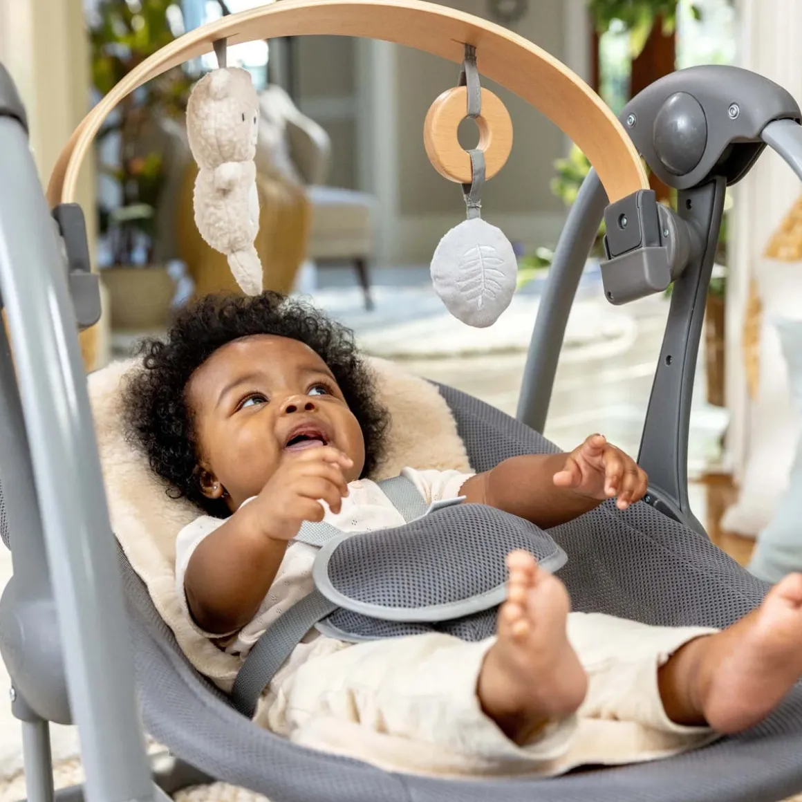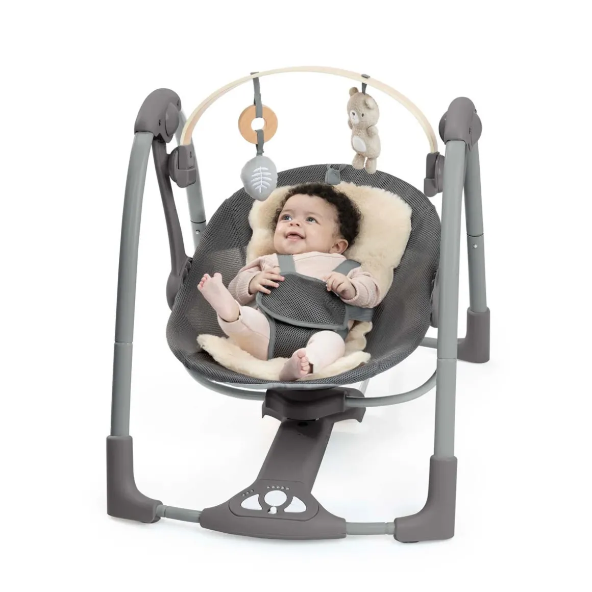 Your little one deserves a cozy environment to help keep them calm. Ingenuity’s Every Season Swing ‘n Go Portable Swing made with Air Flow technology is the simple, all-in-one solution to keeping baby consistently comfortable in any environment. The premium mesh fabric promotes airflow for baby and the extra cozy lambswool is 100% natural and sourced from Australia. Plus, 5 swing speeds with WhisperQuiet™ motor provides less distractions and noise for baby. A detachable toy bar, made with wood from a sustainable forest, includes a removable soft plush Nate the Bear character toy and wooden ring toy. The swing plays soft music and comforting sounds of nature to soothe baby’s fussy moments. With a SlimFold™ design, the swing folds flat for easy mobility and storage and is made for babies ages 0-9 months or up to 20 pounds, whichever comes first. The Every Season Swing ‘n Go Portable Swing is the perfect solution for new parents who want to keep baby comfortable, cozy, and calm all year long.