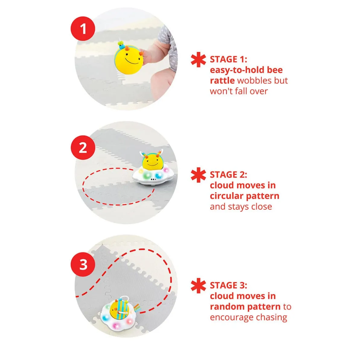 - Stage 1 (Pre-Crawling): Easy-to-hold bee rattle wobbles but won’t fall over