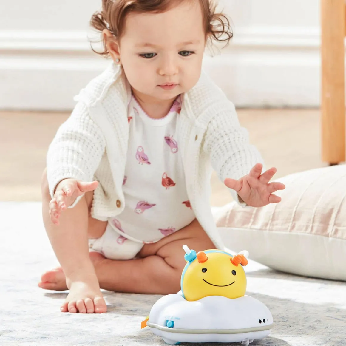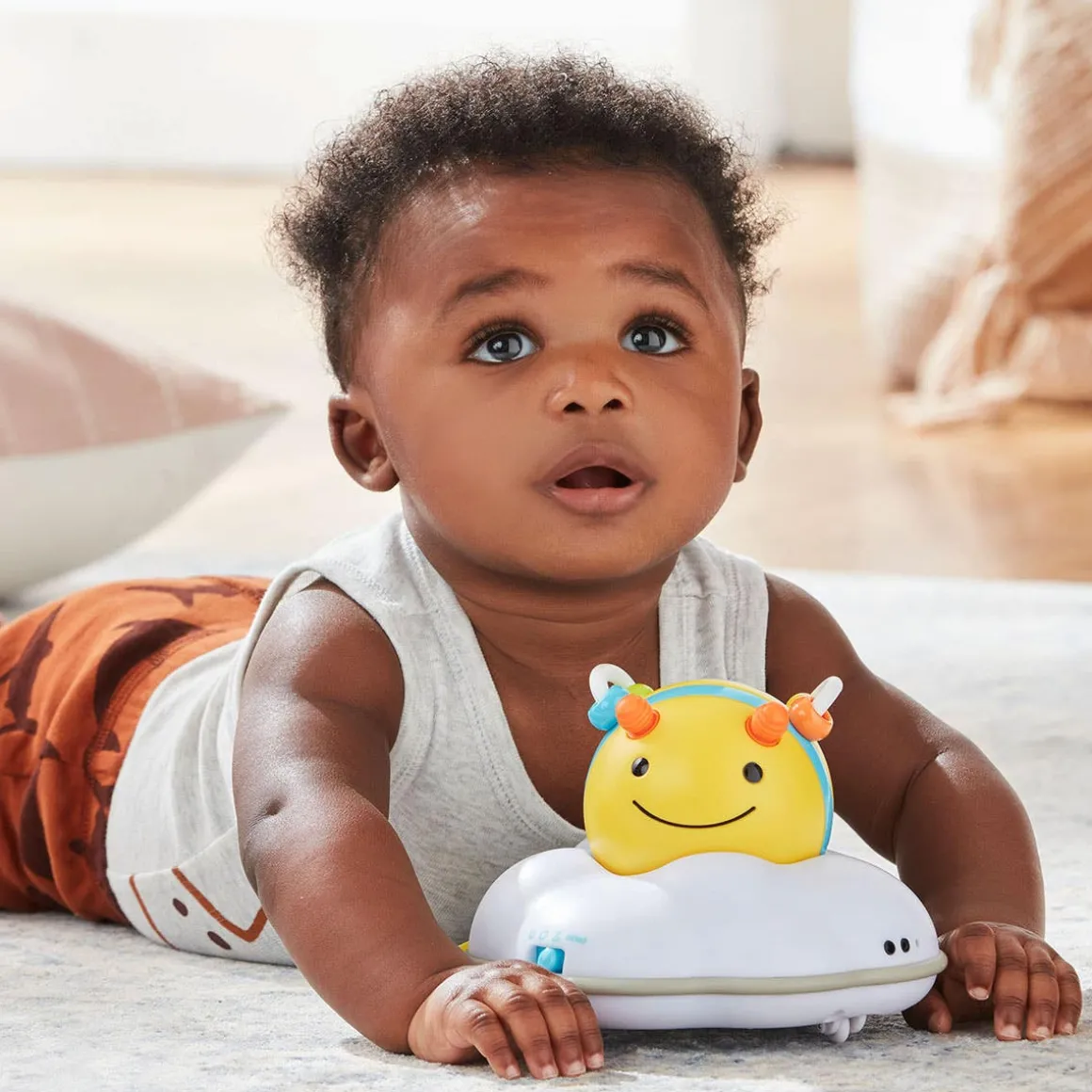 If you’re looking for toys to help baby crawl, you won’t “bee” disappointed with this one! Designed to grow with your baby through three stages, our motorized crawl toy challenges and encourages little ones learning to crawl with colorful lights, energetic tunes and sweet buzzing sounds.