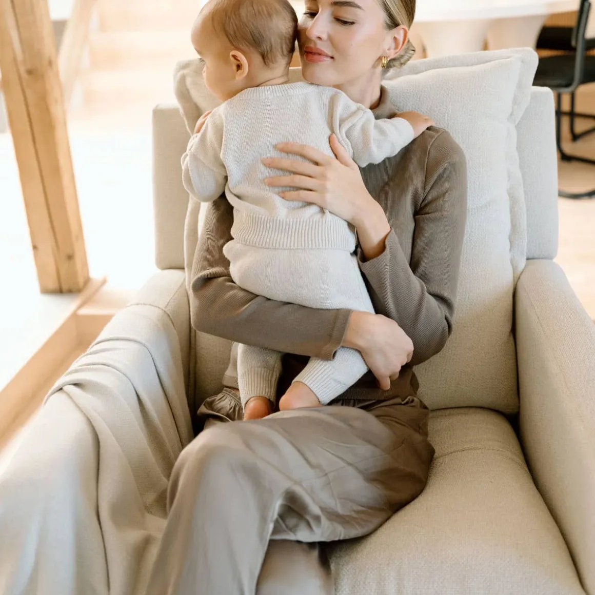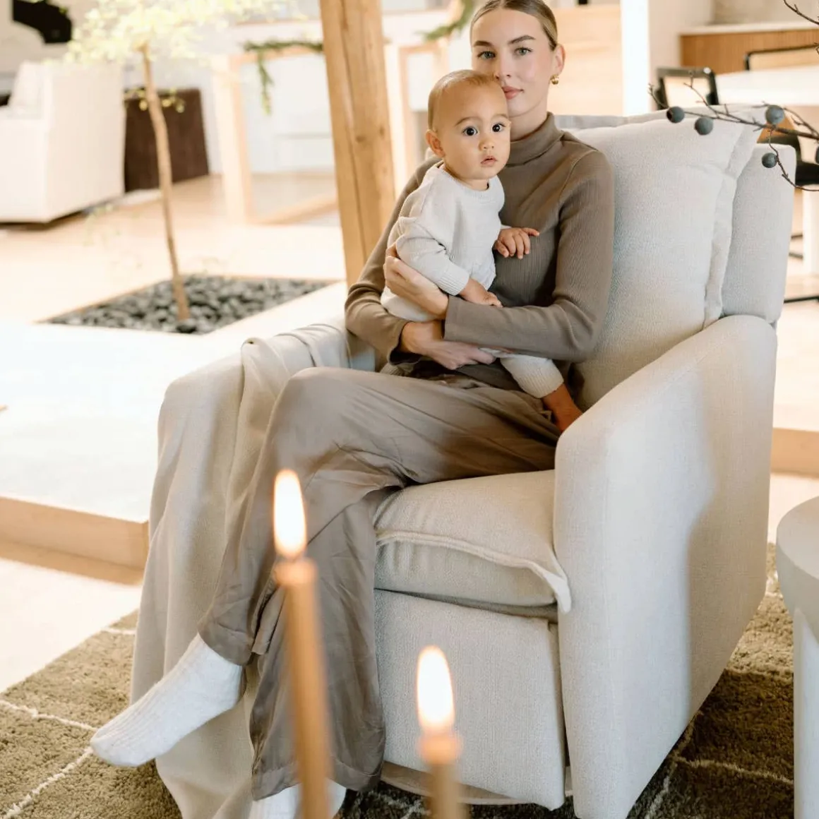 Oilo exclusive Flynn Recliner Glider not only glides, but has a full 360º swivel motion. The Flynn features plush down cushions that allow you to sink into the chair to find your perfect spot, and a hidden recliner lever on the inside of the arm which is easier to reach and has no bulky handle on the outside of the chair. Embrace style, comfort, and sophistication!