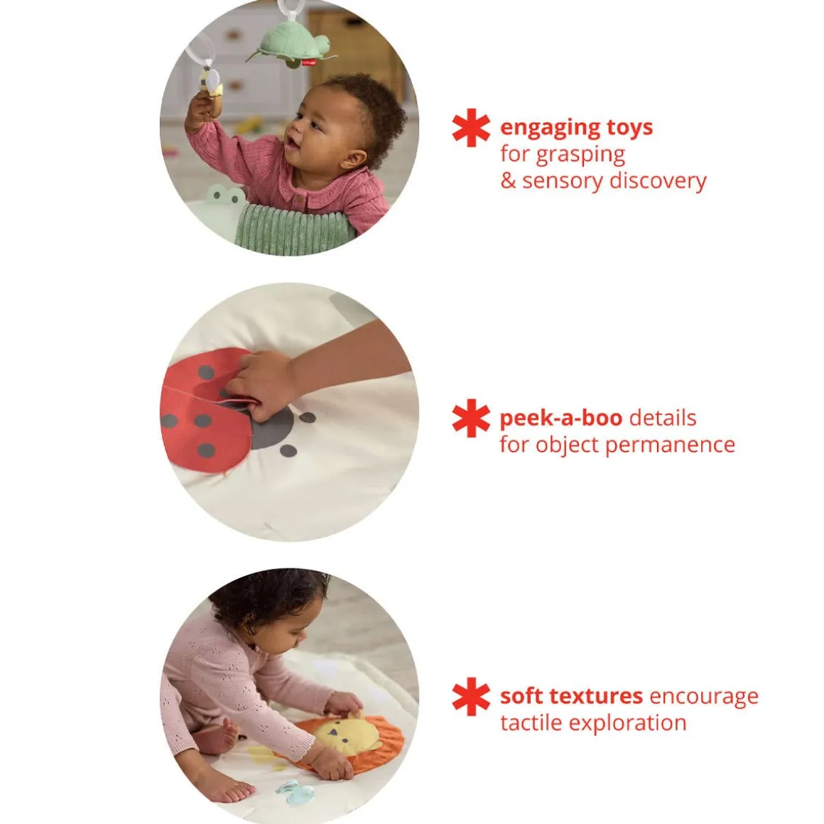 - 3 ways to play: Tummy time, Overhead play, Seated play