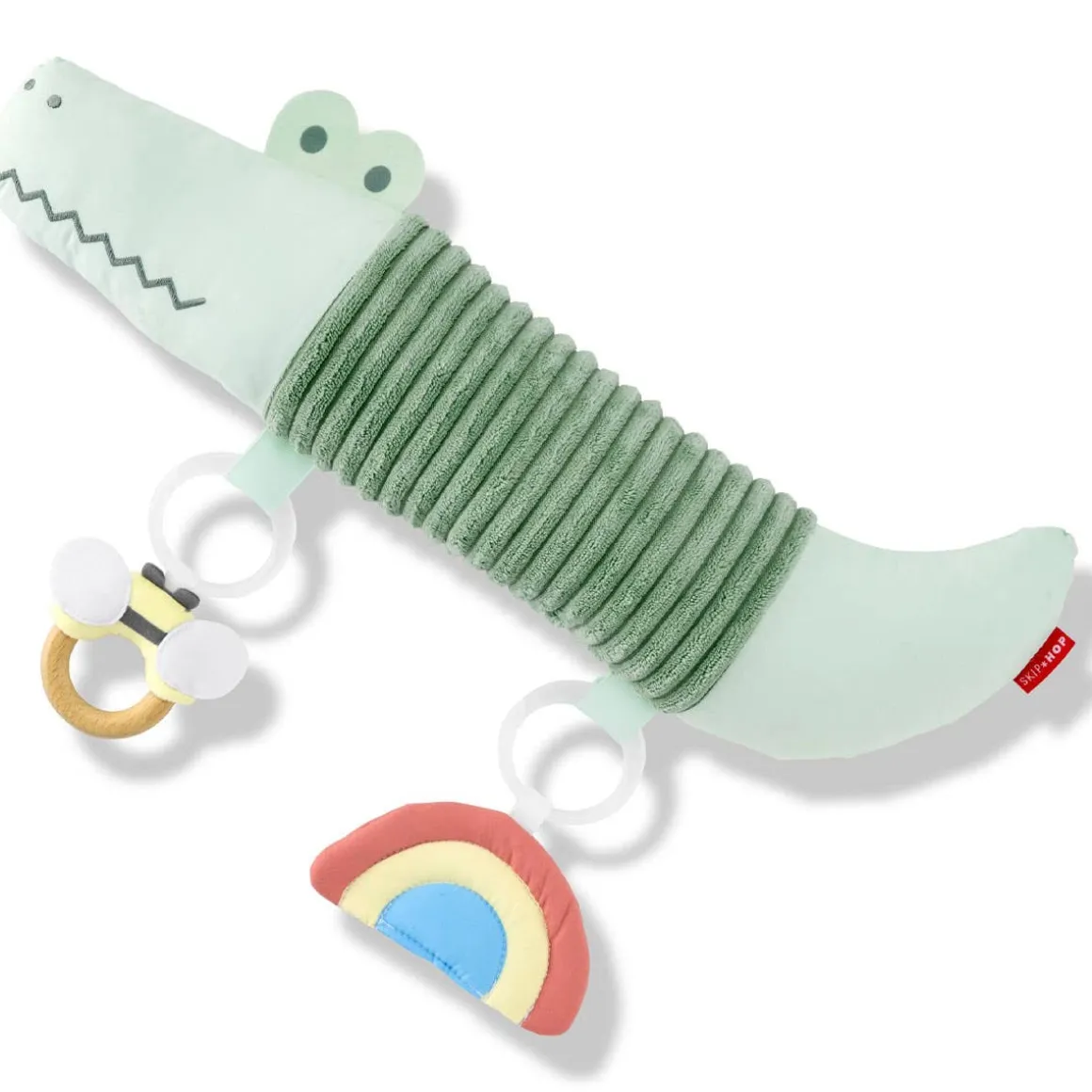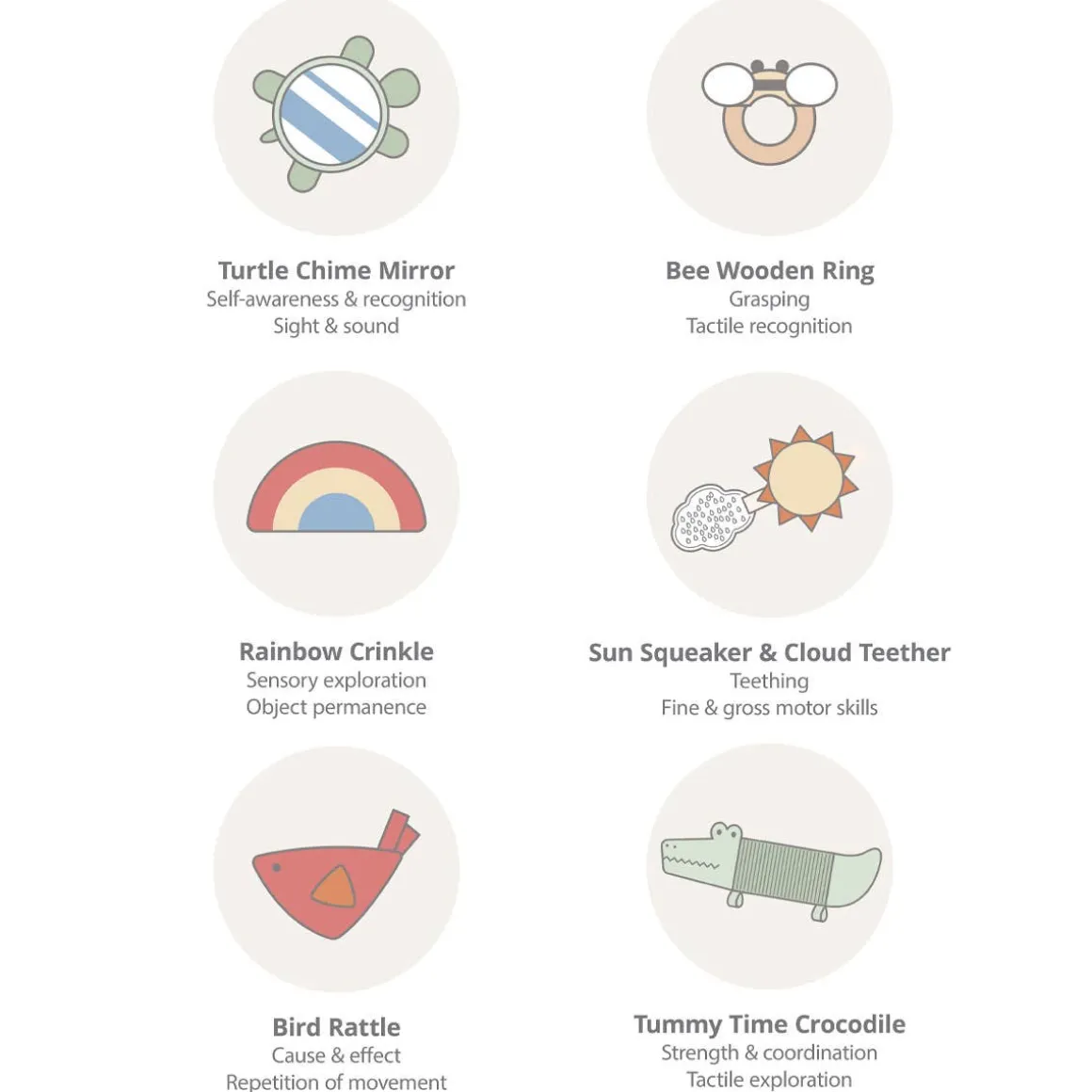 - Tummy time crocodile; 5 Hanging Toys: Bee wooden ring, Sun squeaker with cloud teether, Turtle chime mirror, Rainbow crinkle, Bird rattle