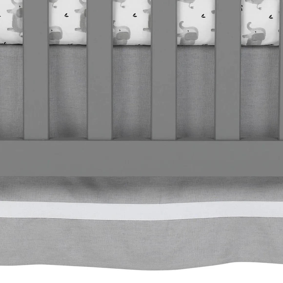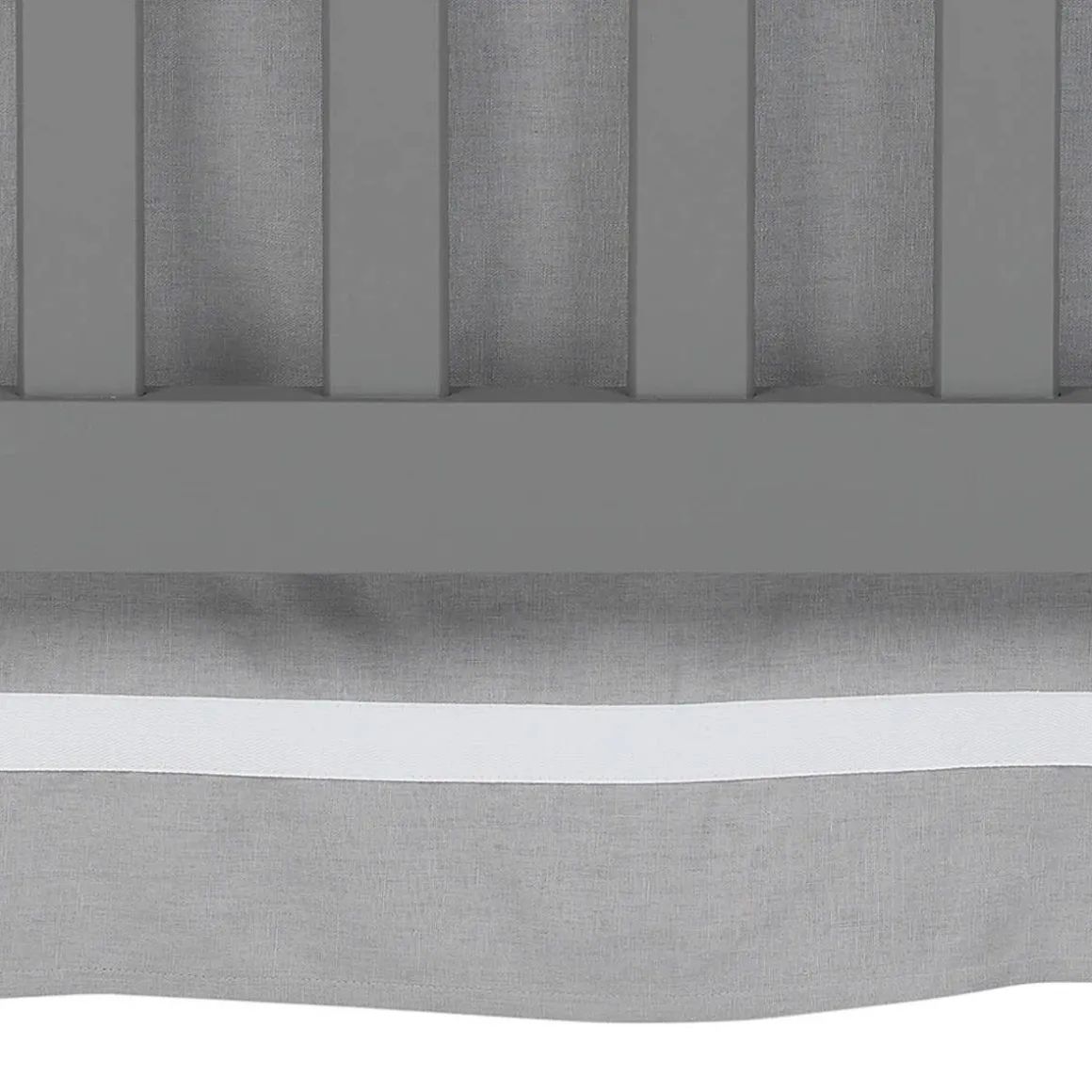 - Crib skirt is made of a gray linen blend