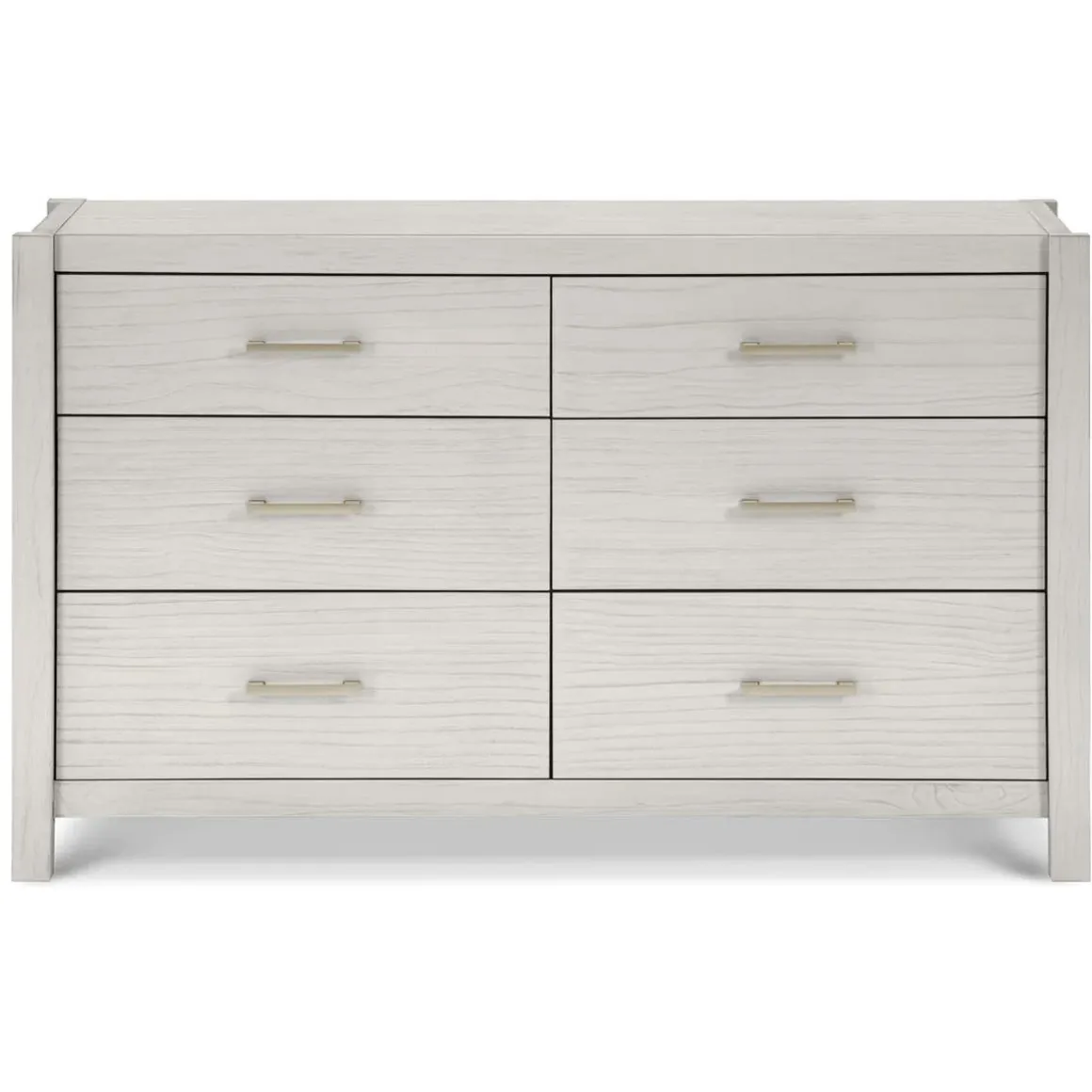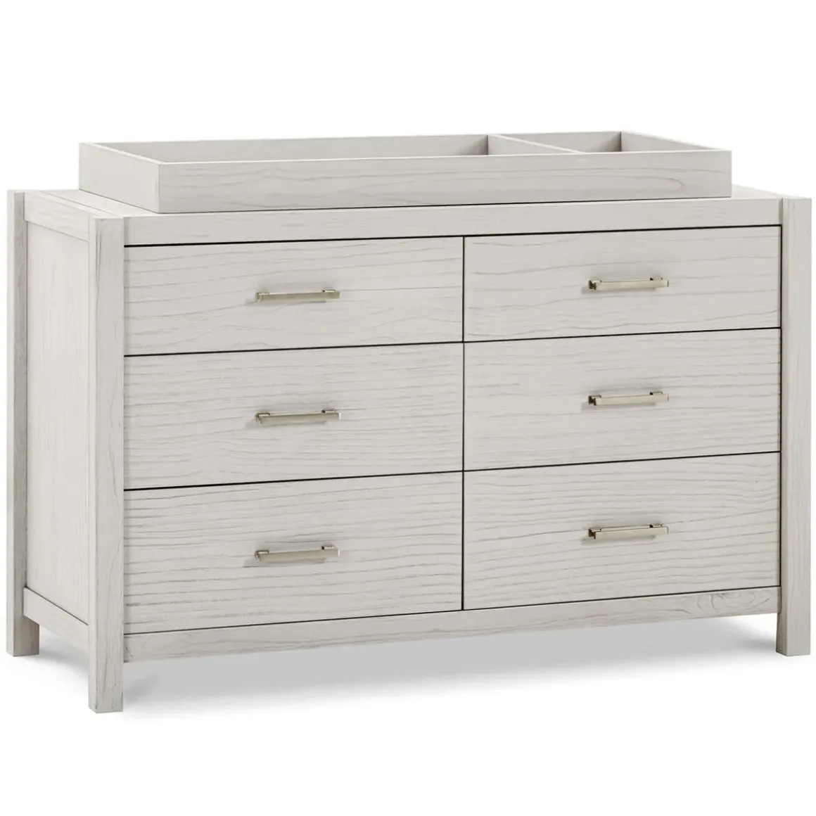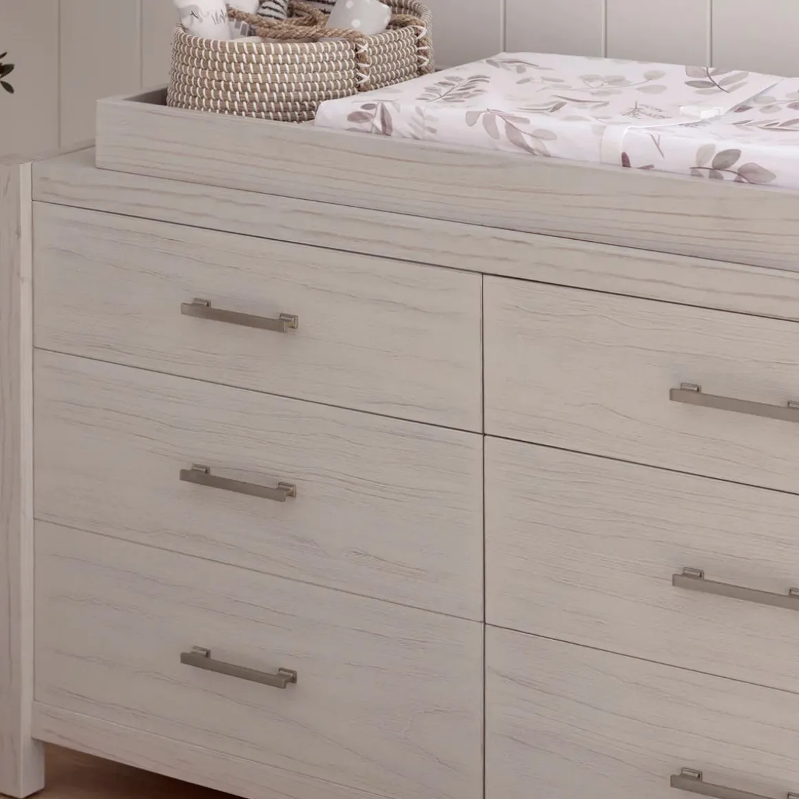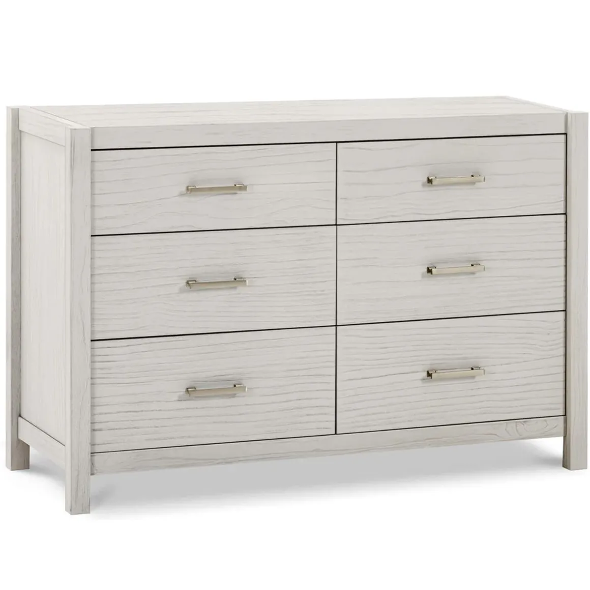 Complete your modern farmhouse nursery with the Hemsted 6-Drawer Dresser, featuring a premium texturized wood finish and elegant gold hardware that enhances the dresser’s contemporary flair. Soft-closing, ball-bearing drawer glides make this dresser easy to use.