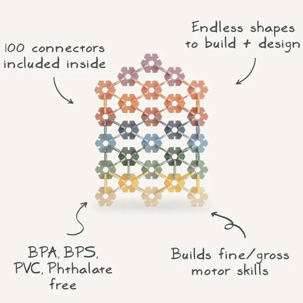 What’s Included: 1 set of 100 pieces of HEX Connect Building Toy Set pieces