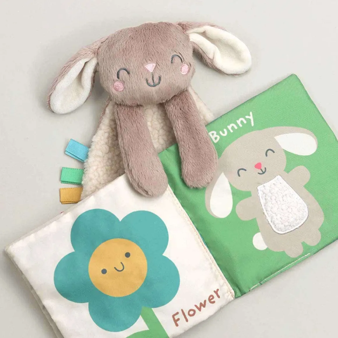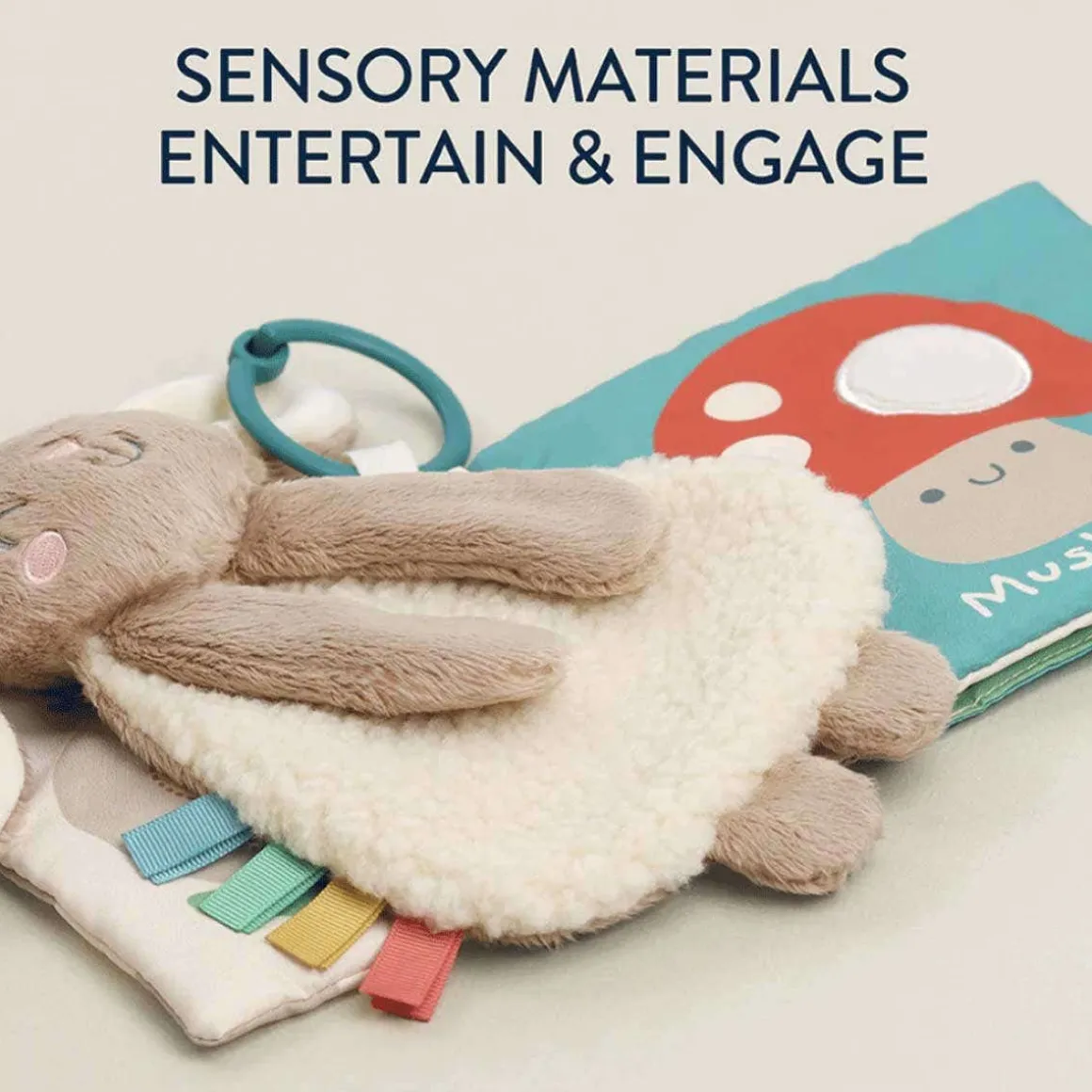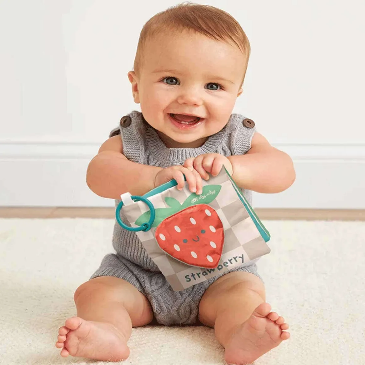 - Soft crinkle book promotes sensory development of touch and sight. Clip allows for on-the-go play.