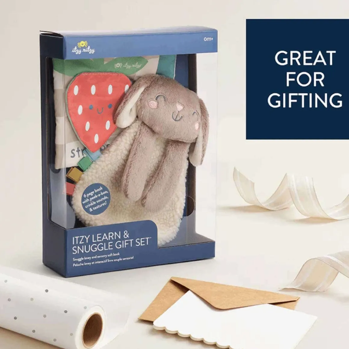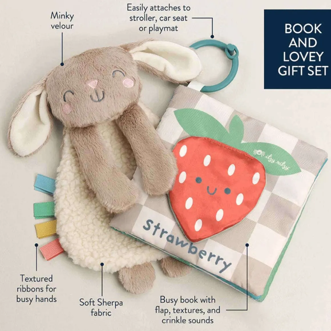 Love is in the details with Itzy Learn & Snuggle Gift Set™! Featuring the Itzy Lovey™ and Bitzy Busy Book™, this gift set is a sensory sensation. Snuggle in close with the soft Sherpa on the Itzy Lovey™. Easily attach the Bitzy Busy Book™ to a car seat or stroller for adventures ahead! The textured pages with crinkle sounds are sure to delight!