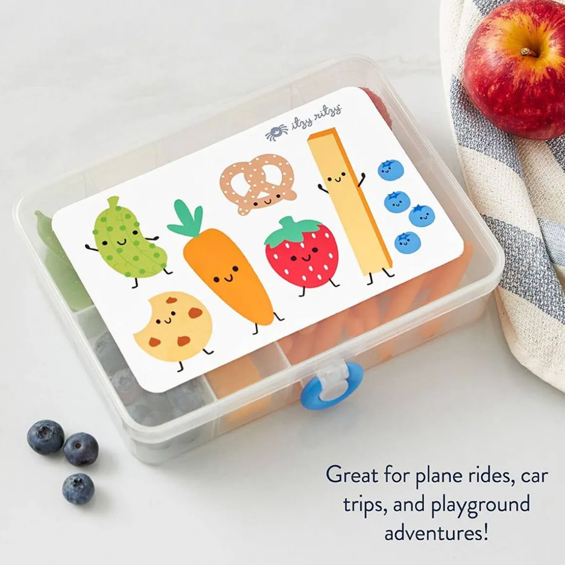 Nibble and Nosh. With six compartments, the snap-tight Itzy Snacks™ divided box separates sweet from salty and soft from crunchy for happy, independent eating. Great for plane rides, car trips, and playground adventures.