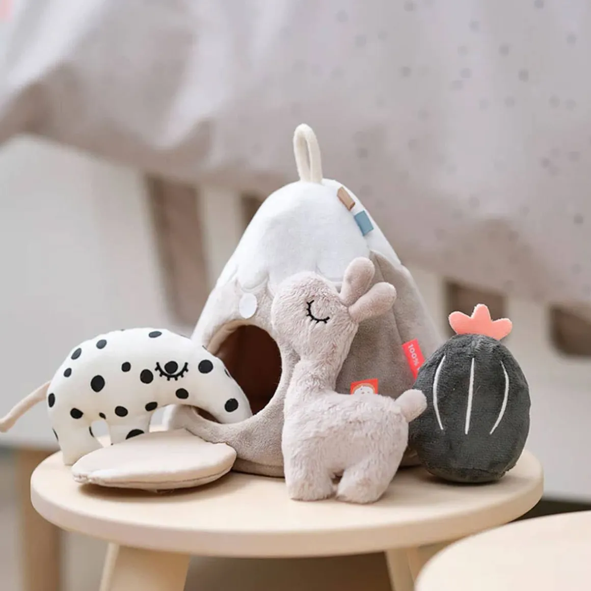 The hide and seek mountain and the small activity toys are in soft shades of sand, blue, green and a splash of coral red.