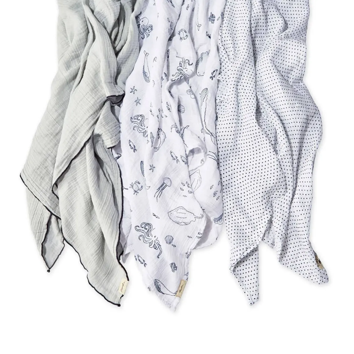 Life Aquatic print depicts a monochromatic scene of aquatic life that is as soothing as it is mesmerizing. With narwhals, sea horses, octopus and minnows, your little one will drift off to sleep amidst the wonder of the sea.