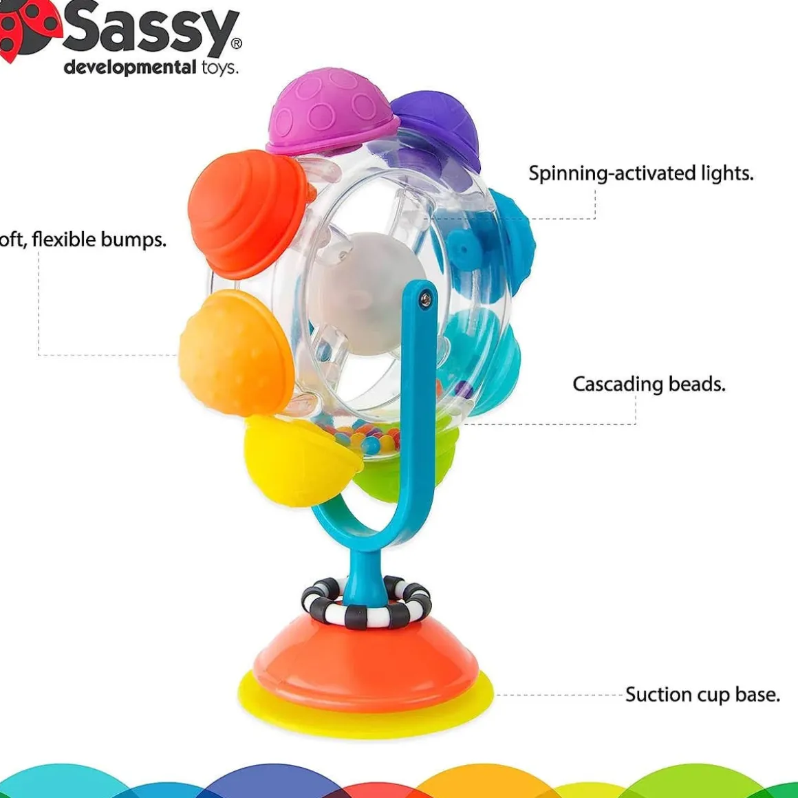 - Colorful, soft touch bumps create rainbow effect when baby spins the wheel.