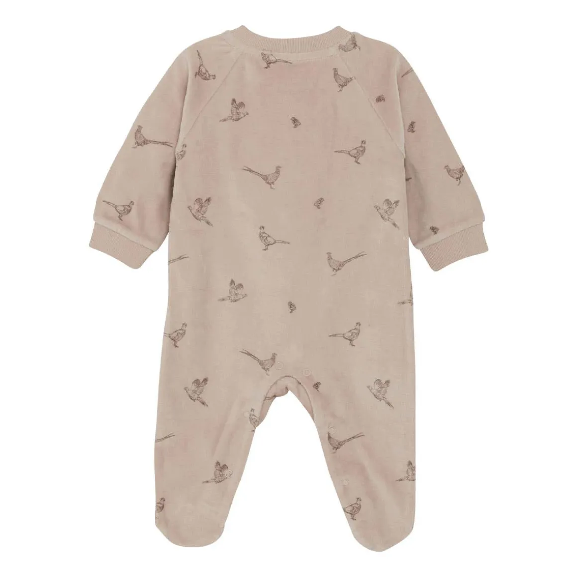 Velour romper with feet from FIXONI. Romper with all-over print. The Romper opens with practical snaps on shoulders and between the legs. Certified acc. to GOTS – organic CERES-0366, OEKO-TEX® STANDARD 100 Cert. No. 2276-365 DTI