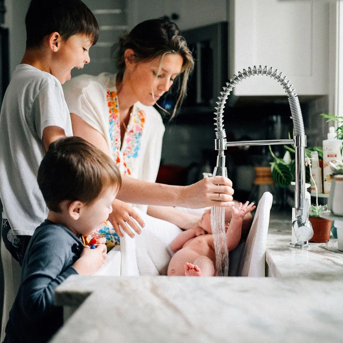 - The Blooming Bath does not hold water. You will need to first insert the stopper inside the drain, then fill up the sink to the desired level and desired temperature before inserting baby. Never run water directly on your baby as water temperature can change quickly.