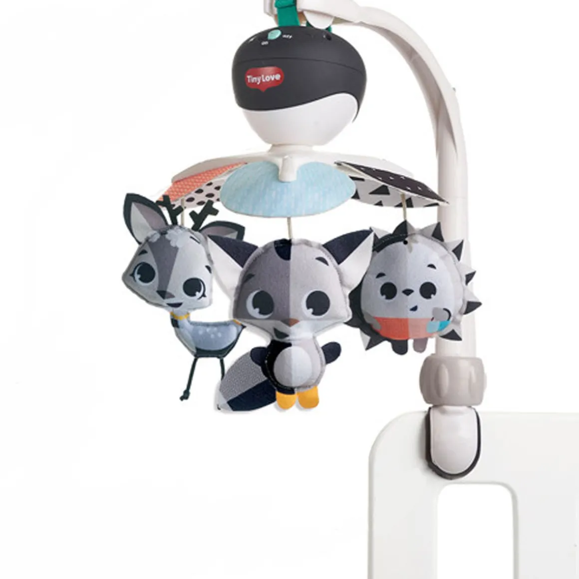 Point out to the smiling characters hanging on the mobile to start building baby’s vocabulary: “Where is the Christopher the Fox? Here he is! Where is Marie the Hedgehog? There she is!”