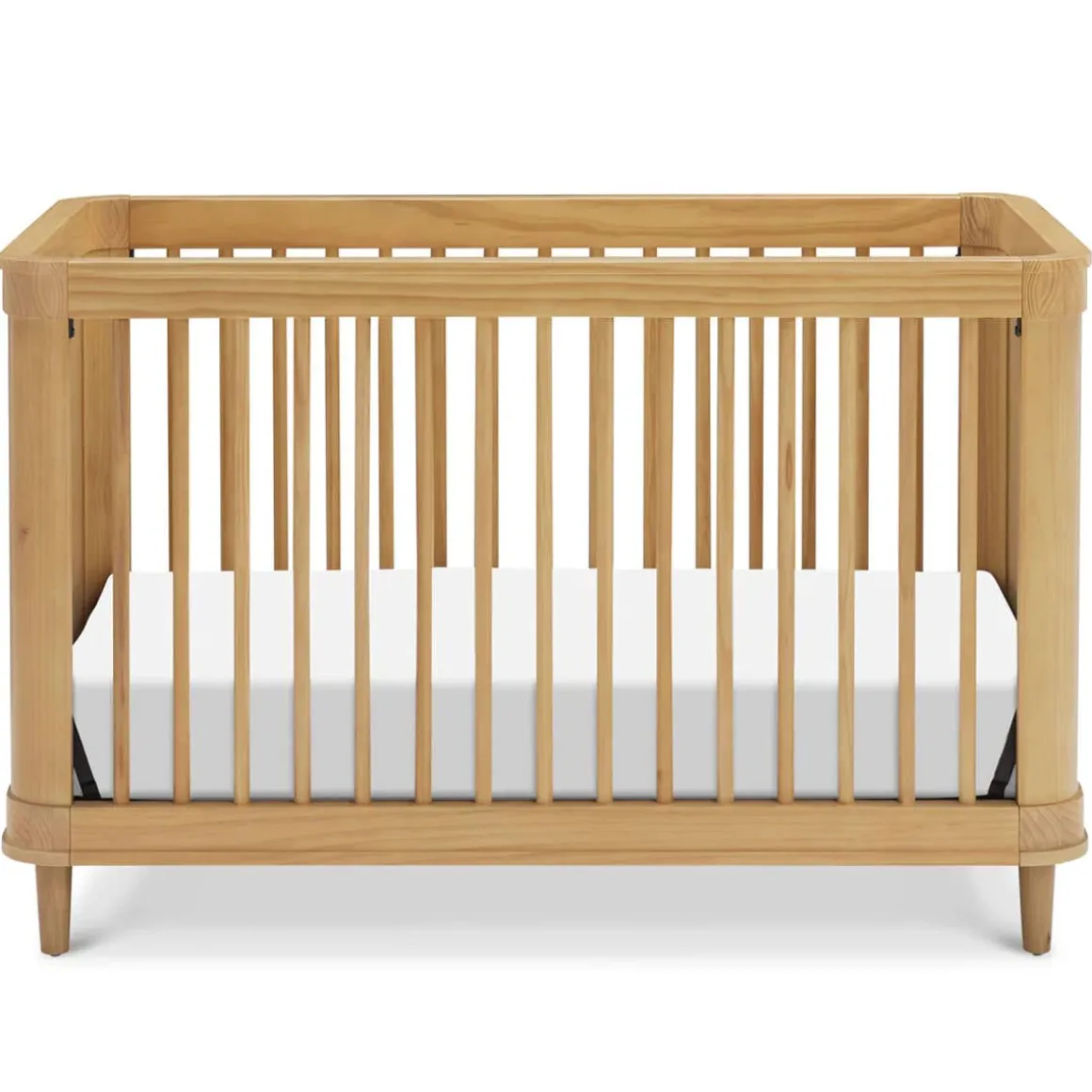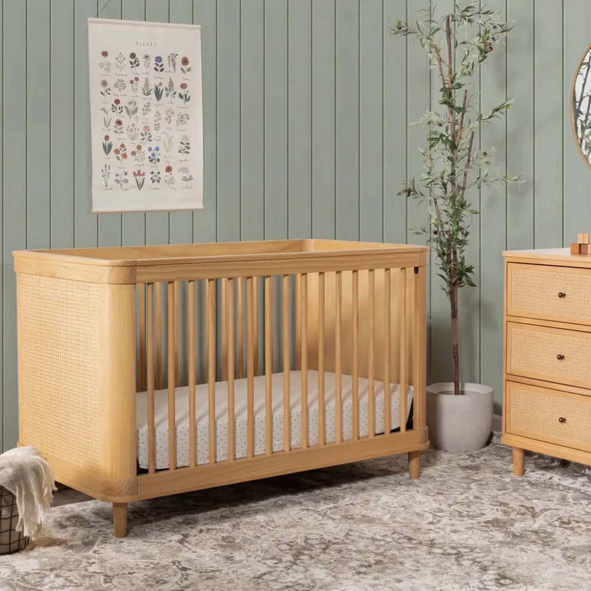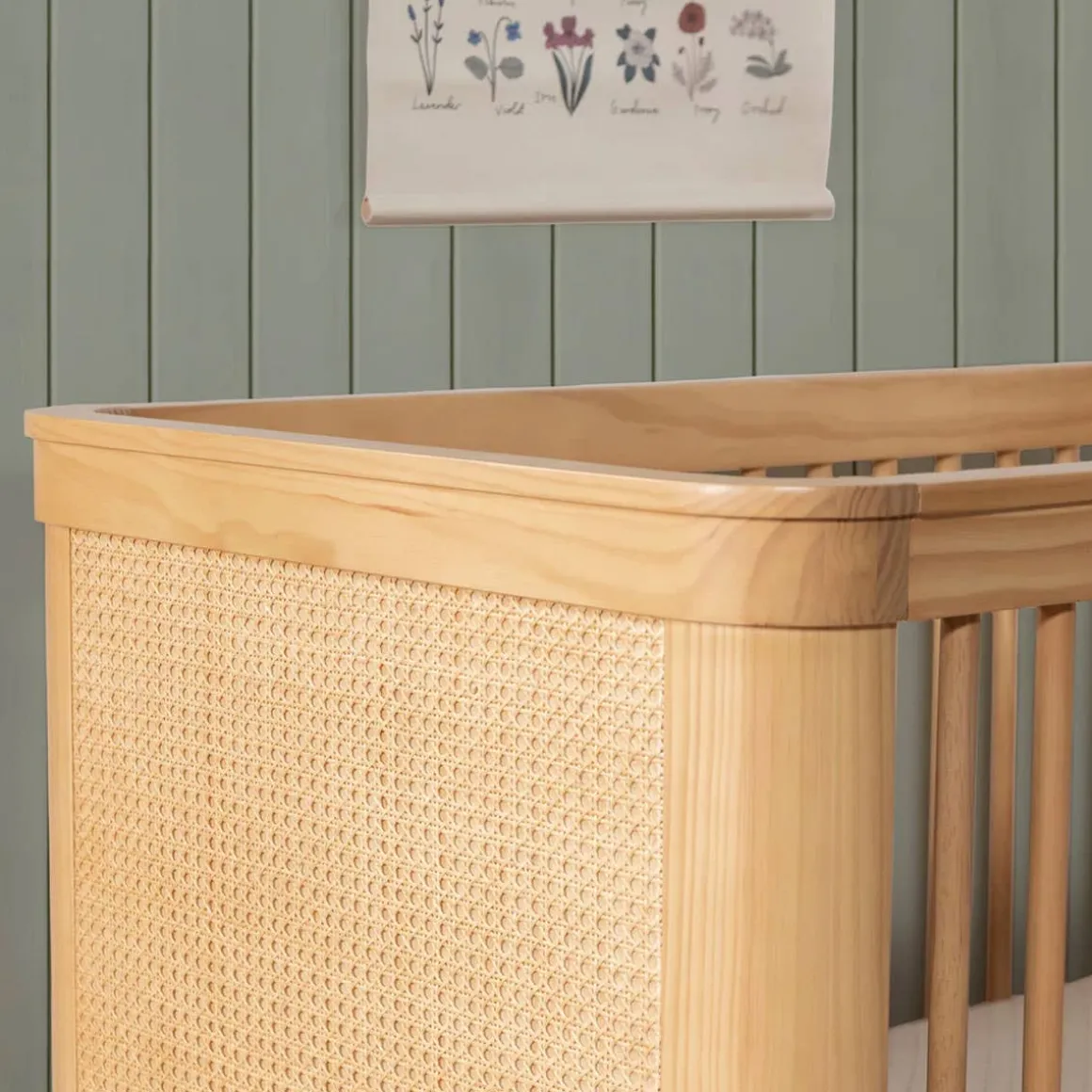 Ease into contemporary style with the Marin 3-in-1 Convertible Crib. Featuring a gently curved silhouette with solid rounded cane side panels, the Marin is an effortlessly transitional piece for the home. Crib converts to a toddler bed and daybed, and fits any standard full-size crib mattress.